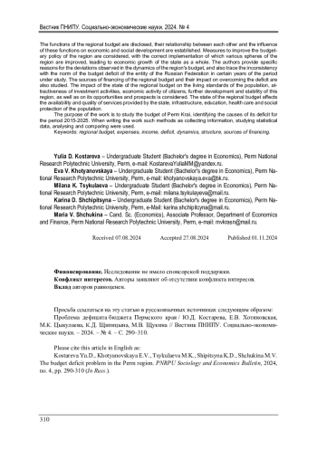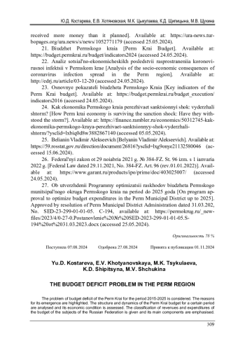 Рассматривается проблема бюджетного дефицита Пермского края за период 2015-2025 гг. Выделяются причины его возникновения. Анализируется структура и динамика бюджета Пермского края за определенный период и оценивается его экономическое состояние. Приводится классификация доходов и расходов бюджета субъектов Российской Федерации и акцентируются ее основные компоненты. Раскрываются функции регионального бюджета, устанавливается их связь между собой и влияние данных функций на экономическое и социальное развитие. Рассматриваются меры по улучшению бюджетной политики региона, при правильном осуществлении которых улучшаются различные сферы региона, что приводит к экономическому росту государства в целом. Авторами приводятся конкретные причины отклонений, наблюдаемых в динамике бюджета региона, а также отслеживается несоответствие норме дефицита бюджета субъекта Российской Федерации в определенные годы исследуемого периода. Также изучаются источники финансирования регионального бюджета и их влияние на преодоление дефицита. Рассматривается влияние состояния регионального бюджета на уровень жизни населения, привлекательность инвестиционной деятельности, экономическую активность граждан, дальнейшее развитие и стабильность этого региона, а также на его возможности и перспективы. Состояние регионального бюджета влияет на доступность и качество услуг, предоставляемых государством, на инфраструктуру, образование, здравоохранение и социальную защиту населения. Целью работы является изучение бюджета Пермского края, выявление причин его дефицита за период 2015-2025 гг. При написании работы использовались такие метода, как сбор информации, изучение статистических данных, анализ и сравнение.