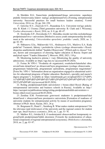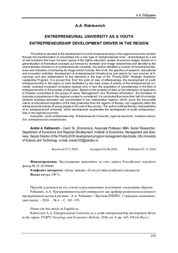 РАБЦЕВИЧ А. А. ПРЕДПРИНИМАТЕЛЬСКИЙ УНИВЕРСИТЕТ КАК ДРАЙВЕР РАЗВИТИЯ МОЛОДЕЖНОГО ПРЕДПРИНИМАТЕЛЬСТВА В РЕГИОНЕ // ВЕСТНИК ПЕРМСКОГО НАЦИОНАЛЬНОГО ИССЛЕДОВАТЕЛЬСКОГО ПОЛИТЕХНИЧЕСКОГО УНИВЕРСИТЕТА. СОЦИАЛЬНО-ЭКОНОМИЧЕСКИЕ НАУКИ. 2024. № 4