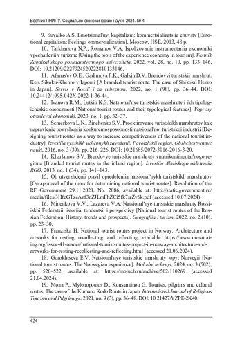 10. Тарханова, Н.П. Использование инструментария экономики впечатлений в туризме / Н.П. Тарханова, В.А. Романов // Вестник Забайкальского государственного университета. - 2022. - Т. 28, № 10. - С. 133-146. DOI: 10.21209/2227924520222810133146 EDN: TOHOII