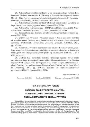 6. Чхотуа, И.З. Глобальные и национальные тренды развития туризма в современных условиях / И.З. Чхотуа, А.А. Мурадов // Стратегирование: теория и практика. - 2023. - Т. 3, № 2. - С. 207-217. DOI: 10.21603/2782-2435-2023-3-2-207-217 EDN: JSNDAW