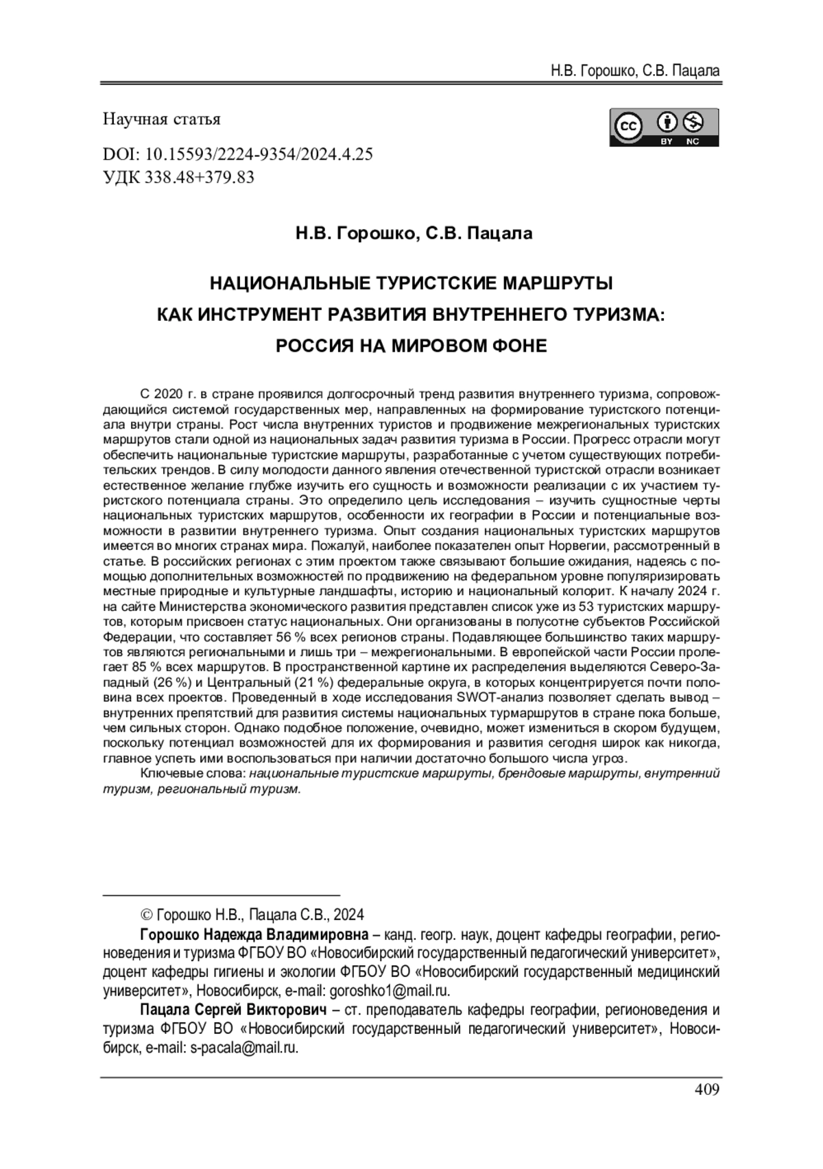 С 2020 г. в стране проявился долгосрочный тренд развития внутреннего туризма, сопровождающийся системой государственных мер, направленных на формирование туристского потенциала внутри страны. Рост числа внутренних туристов и продвижение межрегиональных туристских маршрутов стали одной из национальных задач развития туризма в России. Прогресс отрасли могут обеспечить национальные туристские маршруты, разработанные с учетом существующих потребительских трендов. В силу молодости данного явления отечественной туристской отрасли возникает естественное желание глубже изучить его сущность и возможности реализации с их участием туристского потенциала страны. Это определило цель исследования - изучить сущностные черты национальных туристских маршрутов, особенности их географии в России и потенциальные возможности в развитии внутреннего туризма. Опыт создания национальных туристских маршрутов имеется во многих странах мира. Пожалуй, наиболее показателен опыт Норвегии, рассмотренный в статье. В российских регионах с этим проектом также связывают большие ожидания, надеясь с помощью дополнительных возможностей по продвижению на федеральном уровне популяризировать местные природные и культурные ландшафты, историю и национальный колорит. К началу 2024 г. на сайте Министерства экономического развития представлен список уже из 53 туристских маршрутов, которым присвоен статус национальных. Они организованы в полусотне субъектов Российской Федерации, что составляет 56 % всех регионов страны. Подавляющее большинство таких маршрутов являются региональными и лишь три - межрегиональными. В европейской части России пролегает 85 % всех маршрутов. В пространственной картине их распределения выделяются Северо-Западный (26 %) и Центральный (21 %) федеральные округа, в которых концентрируется почти половина всех проектов. Проведенный в ходе исследования SWOT-анализ позволяет сделать вывод - внутренних препятствий для развития системы национальных турмаршрутов в стране пока больше, чем сильных сторон. Однако подобное положение, очевидно, может измениться в скором будущем, поскольку потенциал возможностей для их формирования и развития сегодня широк как никогда, главное успеть ими воспользоваться при наличии достаточно большого числа угроз.