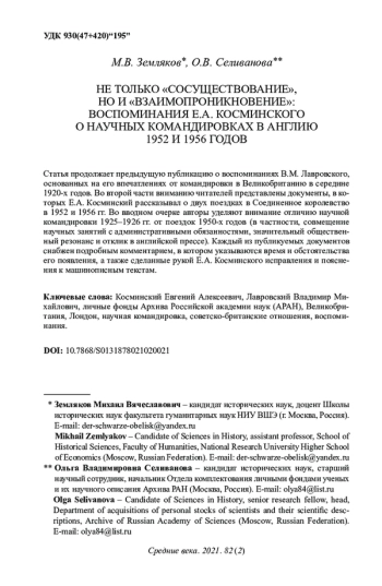 Данная статья является логическим продолжением публикации воспоминаний В. М. Лавровского о научной командировке в Англию 1925–1926 гг.1 На этот раз авторы представляют читателям воспоминания и впечатления Е. А. Косминского о его поездках в Великобританию в 1952 и 1956 гг.