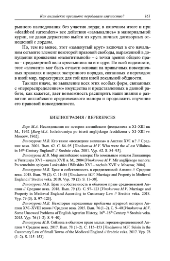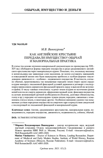 ВИНОКУРОВА М. В. КАК АНГЛИЙСКИЕ КРЕСТЬЯНЕ ПЕРЕДАВАЛИ ИМУЩЕСТВО? ОБЫЧАЙ И МАНОРИАЛЬНАЯ ПРАКТИКА // СРЕДНИЕ ВЕКА. 2021. Т. 82 № 2