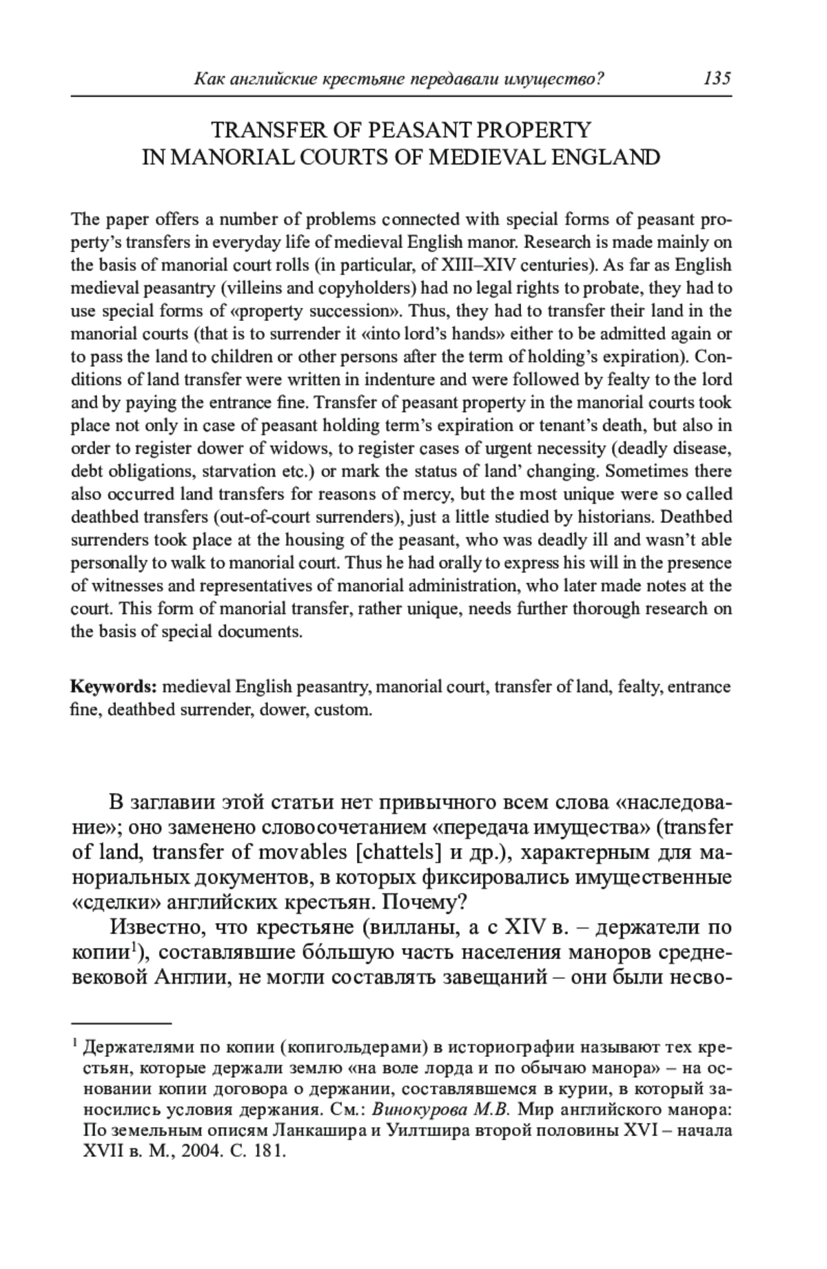 В статье (на основе изучения манориальной документации по преимуществу XIII-XIV вв.) обобщаются формы передачи имущества в среде средневекового английского крестьянства через манориальную курию. Показано, что, поскольку вилланы и копигольдеры как зависимые слои населения, не могли составлять завещаний, в повседневной жизни они были вынуждены прибегать к особым формам «наследования» движимого и - особенно - недвижимого имущества. В частности, согласно обычаю, практиковались так называемые передачи земли (через «руки лорда» в курии манора) с письменной фиксацией условий держания в договоре с последующим принесением держателем феодальной присяги лорду и выплатой им вступного файна. К числу таковых относились: «сдача» земли в курии по истечении сроков копий или после смерти держателя; оформление вдовьей доли; фиксация имущества в случаях возникающей срочной необходимости (болезнь, долговые обязательства, голод и пр.); передачи «из милосердия» чужим лицам; передачи, связанные с изменением статуса земли, и некоторые другие. Особенное внимание уделено так называемым устным передачам имущества на смертном одре в присутствии свидетелей с последующей их письменной фиксацией в манориальной курии.