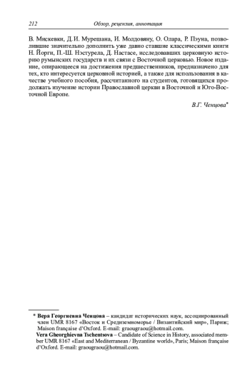 История церкви в раннее Новое время в государствах Восточной и Юго-Восточной Европы сейчас привлекает все большее внимание исследователей, что связано в том числе и с современными проблемами, переживаемыми православием. Особенно важное значение, как представляется, имеет дальнейшее изучение церковной истории румынских государств, ведь после завоевания османами Византии именно к господарям Валашского и Молдавского княжеств перешли обязанности покровитель - ства церкви и монастырям на бывших территориях империи. Византийские традиции в румынских землях поддерживались также благодаря постоянному и значительному греческому присутствию: в княжествах подолгу жили влиятельные представители греческого духовенства. Вассальные по отношению к Османской империи государства оказались единственным самоуправляемым анклавом внутри сложившегося после завоевания «Pax Ottomana», где православие оставалось конфессией и большинства населения, и политической элиты