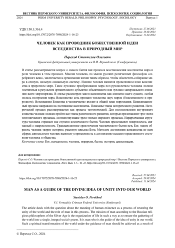 В статье рассматривается вопрос о смысле бытия как процесса восстановления всеединства мира и роли человека в этом процессе. Миссия человека, по мысли русских религиозных философов «серебряного века», заключается в организации жизни таким образом, чтобы обеспечить собирание мира в единую, цельную социальную систему. Именно человек является проводником идеи всеединства в природном мире. Такое духовное преобразование мира под руководством человека должно достигаться в результате органического субъектно-объективного или духовно-материального единения всего миропорядка. В статье рассмотрен закон всеединства как единство всего сущего, особая модель построения мира. Всеединство есть принцип тождества двух миров (божественного и природного). Воплощение Божества в человечество входит в общий план мироздания. Цивилизационный процесс направлен на достижение всеединства. Показаны этапы исторического развития. Исторический процесс рассматривается как процесс теогонический. Для восстановления внутреннего единства человек должен пройти все этапы религиозного развития, которые представляют три эпохи теогонического процесса, соответствующие трем эпохам мирового процесса. Иерархическая структура человека отражает все ступени космического бытия. Человек представляет микрокосмос, связанный с макрокосмосом. Трансцендентное средоточение человеческого бытия есть Бог, таким образом, человек творит историю, реализуя замысел Бога. Методом достижения всеединства во всех сферах деятельности человек является устремленность к достижению высшего нравственного состояния человека и общества.