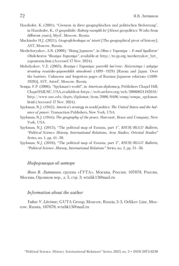 5. Спикмэн 2015 - Спикмэн Н.Дж. Политическая карта Евразии. Ч. 1 / пер. М.Н. Грачева // Вестник РГГУ. Серия «Политология. История. Международные отношения. Зарубежное регионоведение. Востоковедение». 2015. № 1. С. 41-50.