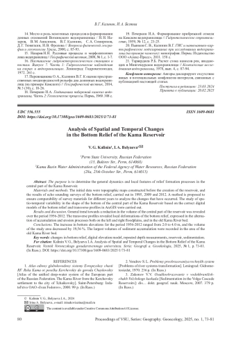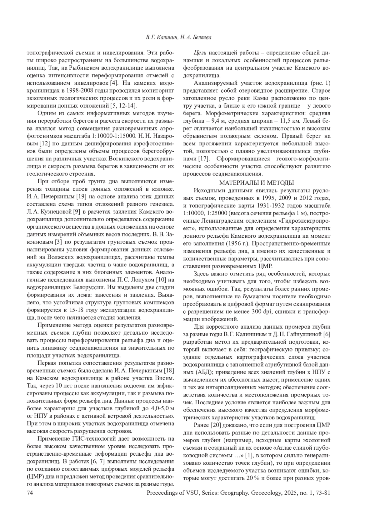 КАЛИНИН В. Г., БЕЛЯЕВА И. А. АНАЛИЗ ПРОСТРАНСТВЕННО-ВРЕМЕННЫХ ИЗМЕНЕНИЙ РЕЛЬЕФА ДНА КАМСКОГО ВОДОХРАНИЛИЩА // ВЕСТНИК ВОРОНЕЖСКОГО ГОСУДАРСТВЕННОГО УНИВЕРСИТЕТА. СЕРИЯ: ГЕОГРАФИЯ. ГЕОЭКОЛОГИЯ. 2025. № 1