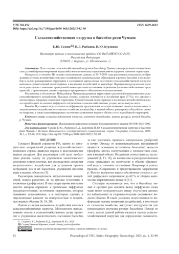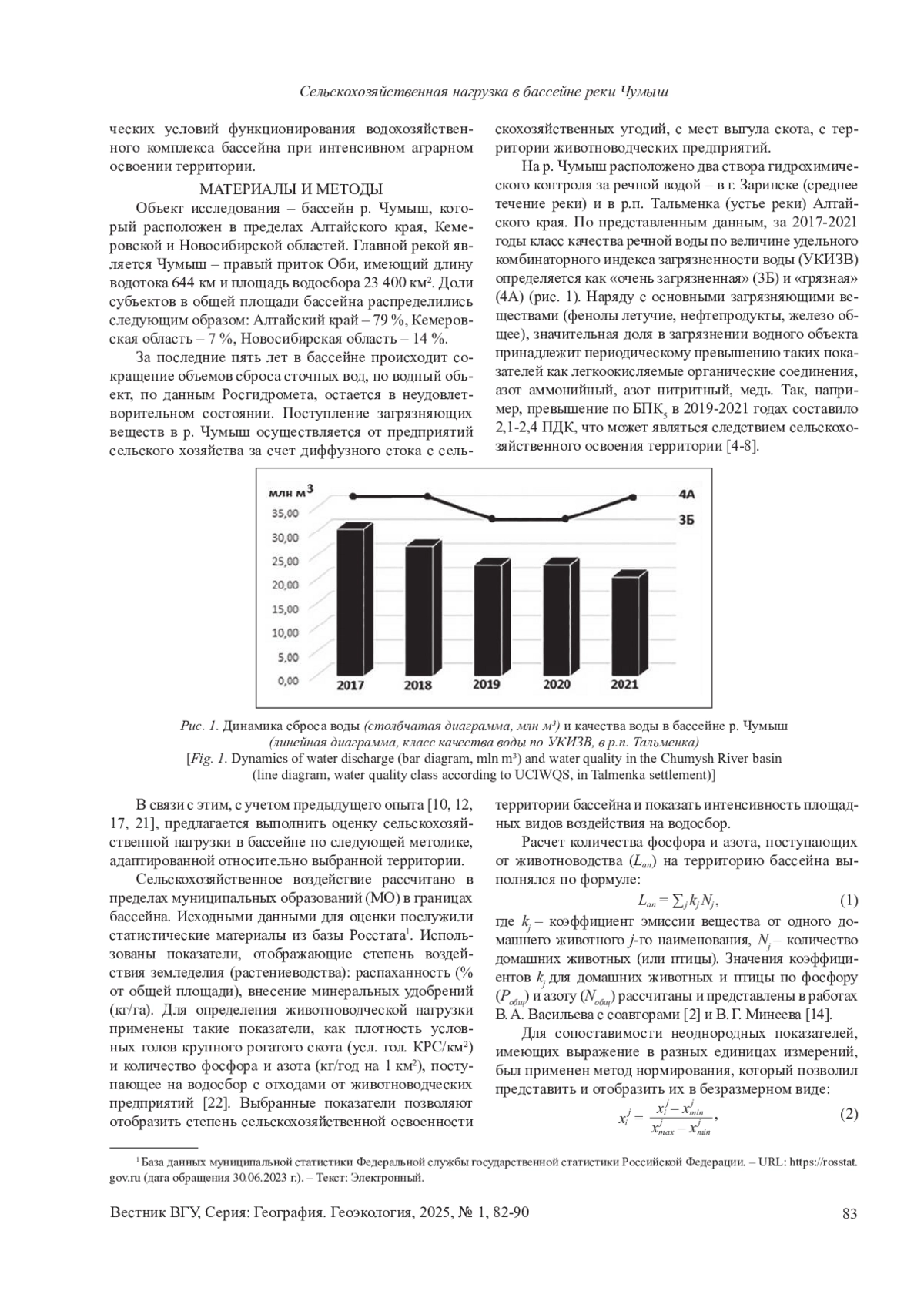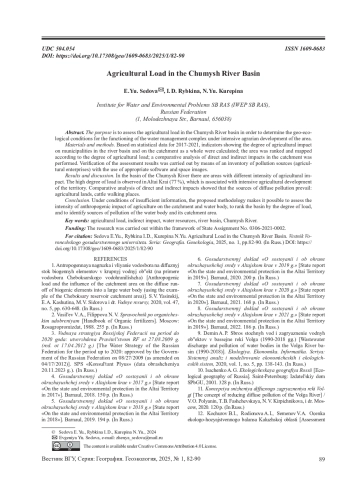 Цель - оценка сельскохозяйственной нагрузки в бассейне р. Чумыш для определения геоэкологических условий функционирования водохозяйственного комплекса при интенсивном аграрном освоении территории. Материалы и методы. На основе статистических данных за 2017-2021 годы рассчитаны показатели, отображающие степень воздействия сельского хозяйства на муниципальные образования в речном бассейне и на водосбор в целом; ранжирование территории и составление карты-схемы по степени сельскохозяйственной нагрузки; выполнен сравнительный анализ прямых и косвенных воздействий на водосборе. Верификация результатов оценки осуществлена с помощью проведенной инвентаризации источников загрязнения (сельскохозяйственных предприятий) с применением соответствующего программного обеспечения и космоснимков. Результаты и обсуждение. В бассейне р. Чумыш выделяются территории с различной интенсивностью сельскохозяйственного воздействия. Высокая степень нагрузки отмечается в Алтайском крае (77%), что связано с интенсивным аграрным освоением территории. Сравнительный анализ прямых и косвенных воздействий показал, что преобладают источники диффузного загрязнения: сельскохозяйственные угодья, места выгула скота. Выводы. В условиях недостаточности информации предложенная методика позволяет оценить интенсивность антропогенного воздействия от сельского хозяйства на водосбор и водный объект, ранжировать бассейн по степени нагрузки, а также идентифицировать источники загрязнения водного объекта и его водосборной территории.