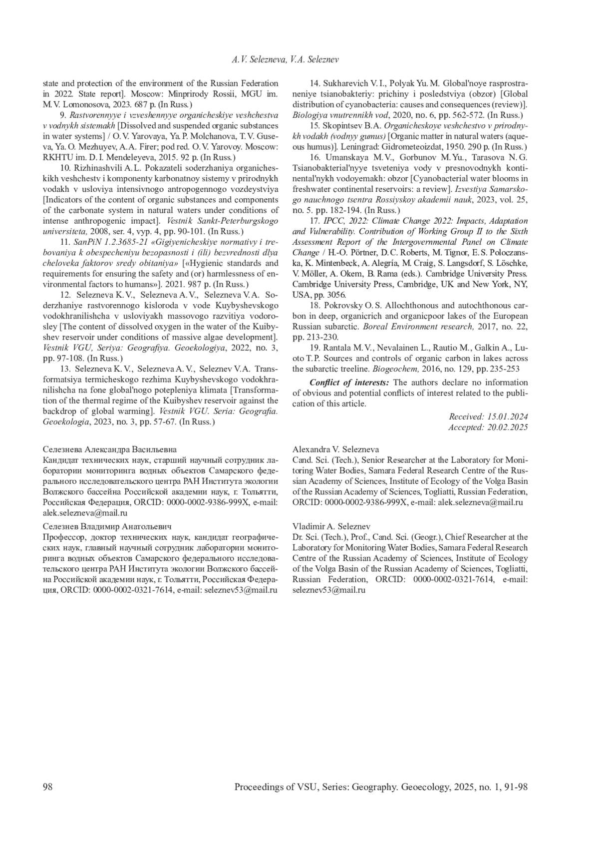 СЕЛЕЗНЕВА А. В., СЕЛЕЗНЕВ В. А. СЕЗОННАЯ ИЗМЕНЧИВОСТЬ СОДЕРЖАНИЯ РАСТВОРЕННЫХ ОРГАНИЧЕСКИХ ВЕЩЕСТВ В ВОДЕ КУЙБЫШЕВСКОГО ВОДОХРАНИЛИЩА // ВЕСТНИК ВОРОНЕЖСКОГО ГОСУДАРСТВЕННОГО УНИВЕРСИТЕТА. СЕРИЯ: ГЕОГРАФИЯ. ГЕОЭКОЛОГИЯ. 2025. № 1
