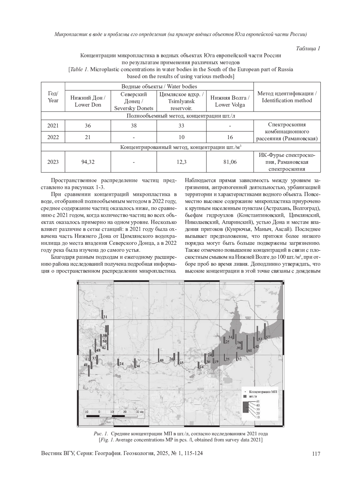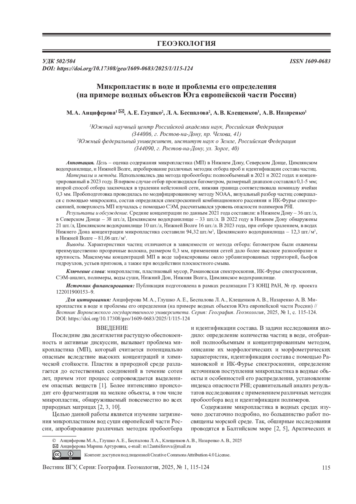 КЛЕЩЕНКОВ А. В., НАЗАРЕНКО А. В., БЕСПАЛОВА Л. А., АНЦИФЕРОВА Г. А., ГЛУШКО А. Е. МИКРОПЛАСТИК В ВОДЕ И ПРОБЛЕМЫ ЕГО ОПРЕДЕЛЕНИЯ (НА ПРИМЕРЕ ВОДНЫХ ОБЪЕКТОВ ЮГА ЕВРОПЕЙСКОЙ ЧАСТИ РОССИИ) // ВЕСТНИК ВОРОНЕЖСКОГО ГОСУДАРСТВЕННОГО УНИВЕРСИТЕТА. СЕРИЯ: ГЕОГРАФИЯ. ГЕОЭКОЛОГИЯ. 2025. № 1