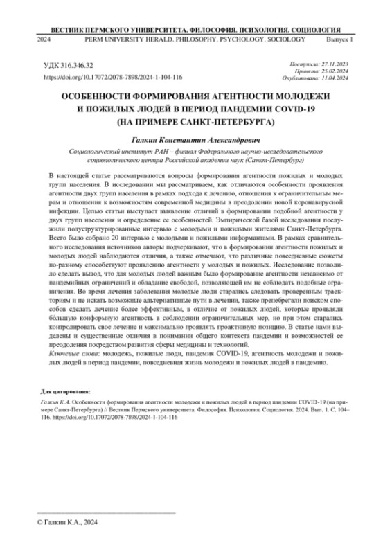 ГАЛКИН К. А. ОСОБЕННОСТИ ФОРМИРОВАНИЯ АГЕНТНОСТИ МОЛОДЕЖИ И ПОЖИЛЫХ ЛЮДЕЙ В ПЕРИОД ПАНДЕМИИ COVID-19 (НА ПРИМЕРЕ САНКТ-ПЕТЕРБУРГА) // ВЕСТНИК ПЕРМСКОГО УНИВЕРСИТЕТА. ФИЛОСОФИЯ. ПСИХОЛОГИЯ. СОЦИОЛОГИЯ. 2024. № 1