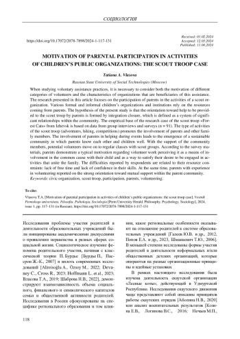 При изучении практик добровольной помощи необходимо учитывать как мотивацию разных категорий волонтеров, так и особенности организаций, которые являются бенефициарами этой помощи. Исследование, представленное в настоящей статье, фокусируется на участии родителей в деятельности скаутской организации. На ресурсы, исходящие от родителей, рассчитывают разные формальные и неформальные детские организации и учреждения. Гипотеза настоящего исследования состояла в том, что установка на помощь со стороны родителей скаутскому отряду опирается на интеграционное замыкание, под которым понимается система значимых для них взаимоотношений внутри сообщества. Эмпирическая база исследовательского кейса скаутского отряда «Лесные коты» из Ижевска опирается на данные групповых интервью и опроса (n = 91). Тип мероприятий скаутского отряда (приключения, походы, соревнования) способствует вовлечению родителей и других членов семьи. Привлечение родителей к помощи во время мероприятий приводит к появлению устойчивого сообщества, в котором родители хорошо знают друг друга и детей. При поддержке членов сообщества потенциальные волонтеры переходят к проведению регулярных занятий с группами скаутов. По материалам опроса, родители демонстрируют типичную мотивацию относительно волонтерской работы с преобладанием ценностей причастности к общему делу и стремлением к деятельности, объединяющей семью. Трудности, о которых сообщают респонденты, связаны с ресурсными ограничениями: недостатком времени и неуверенностью в своих умениях и навыках. При этом родители, имеющие опыт добровольческой помощи, сообщили о сложившейся установке на взаимную поддержку внутри родительского сообщества.