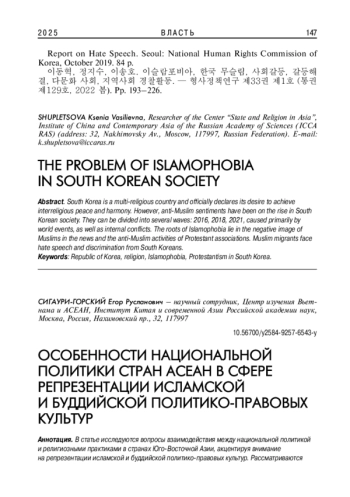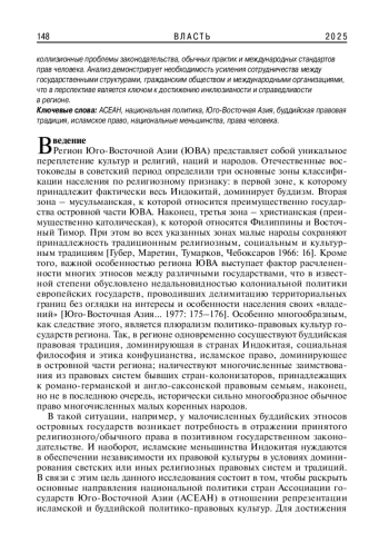 В статье исследуются вопросы взаимодействия между национальной политикой и религиозными практиками в странах Юго-Восточной Азии, акцентируя внимание на репрезентации исламской и буддийской политико-правовых культур. Рассматриваются коллизионные проблемы законодательства, обычных практик и международных стандартов прав человека. Анализ демонстрирует необходимость усиления сотрудничества между государственными структурами, гражданским обществом и международными организациями, что в перспективе является ключом к достижению инклюзивности и справедливости в регионе.