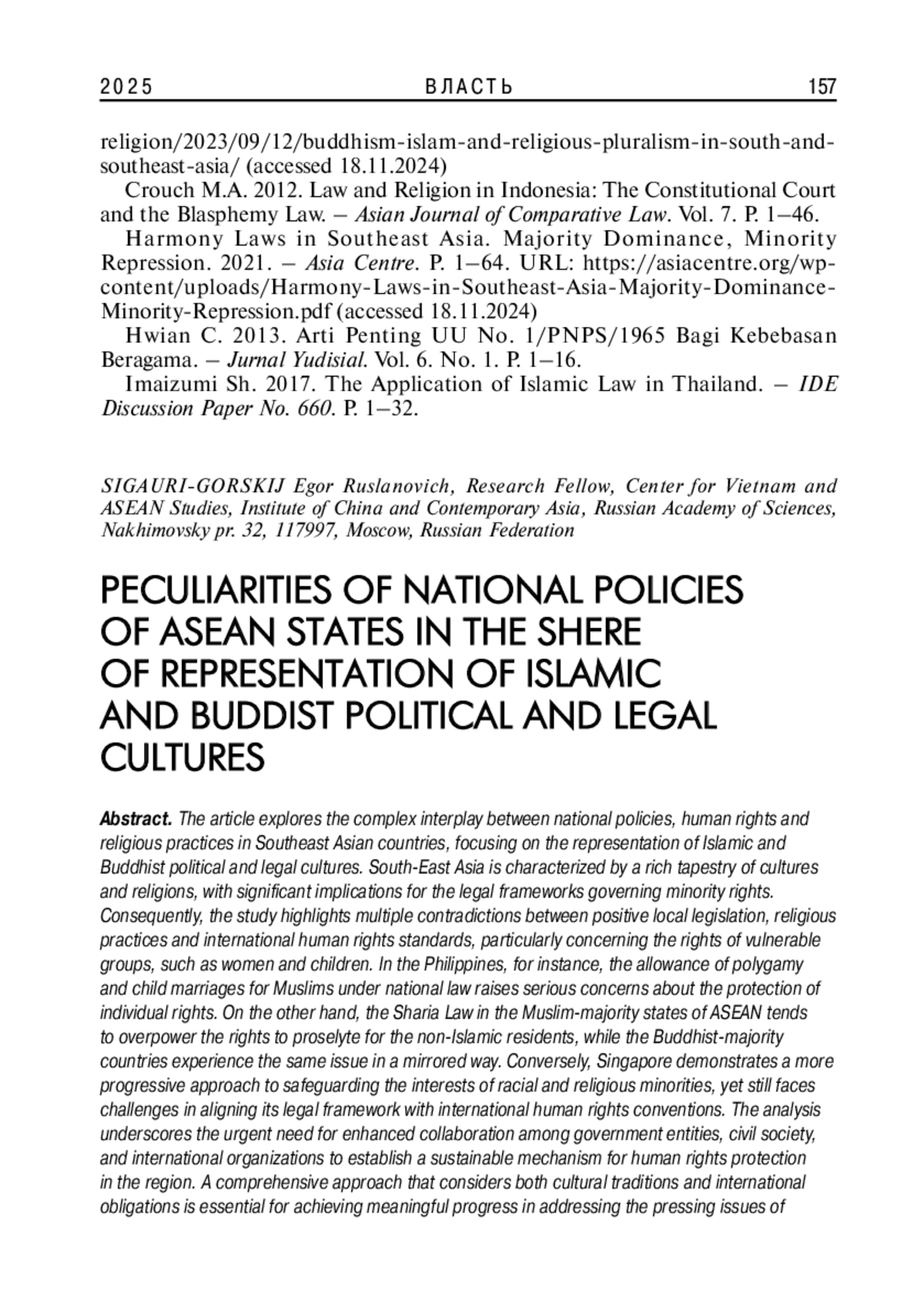 8. Crouch M.A. 2012. Law and Religion in Indonesia: The Constitutional Court and the Blasphemy Law. - Asian Journal of Comparative Law. Vol. 7. P. 1-46.