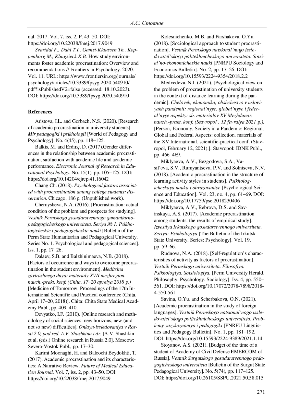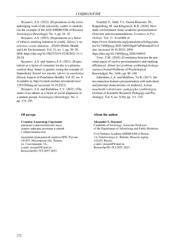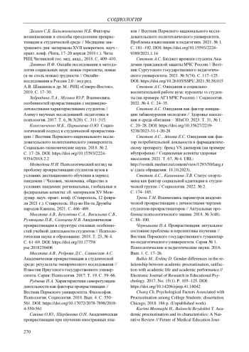СТОЯНОВ А. С. СОЦИАЛЬНЫЕ ФАКТОРЫ АКАДЕМИЧЕСКОЙ ПРОКРАСТИНАЦИИ // ВЕСТНИК ПЕРМСКОГО УНИВЕРСИТЕТА. ФИЛОСОФИЯ. ПСИХОЛОГИЯ. СОЦИОЛОГИЯ. 2024. № 2