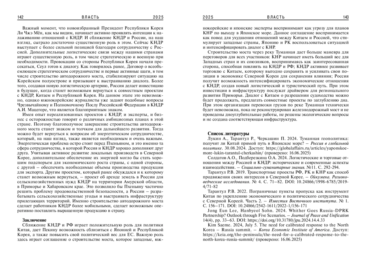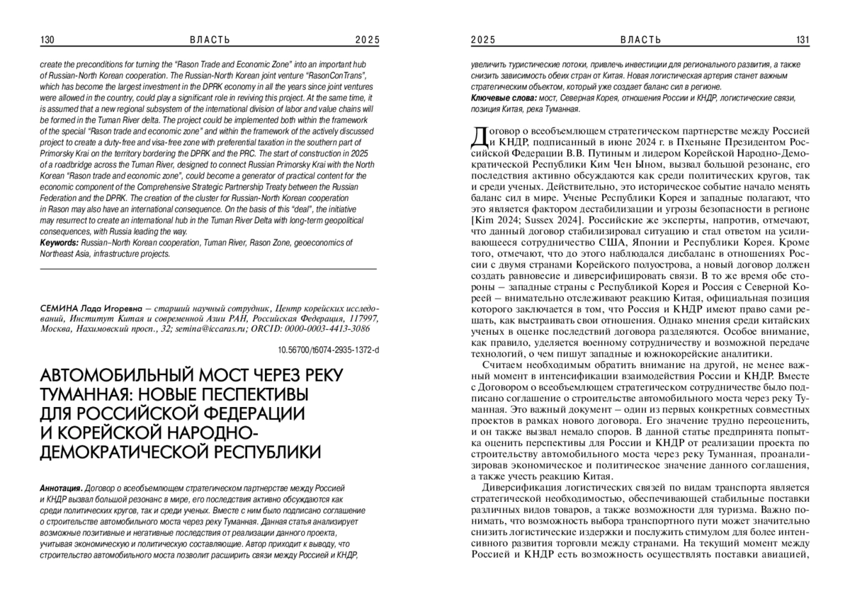 СЕМИНА Л. И. АВТОМОБИЛЬНЫЙ МОСТ ЧЕРЕЗ РЕКУ ТУМАННАЯ: НОВЫЕ ПЕСПЕКТИВЫ ДЛЯ РОССИЙСКОЙ ФЕДЕРАЦИИ И КОРЕЙСКОЙ НАРОДНО- ДЕМОКРАТИЧЕСКОЙ РЕСПУБЛИКИ // ВЛАСТЬ. 2025. ТОМ 33 № S4