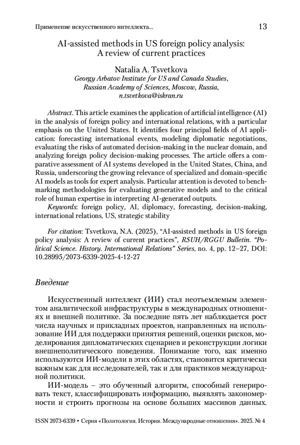 Статья посвящена анализу направлений использования искусственного интеллекта (ИИ) в исследованиях внешней политики и международных отношений. Автор рассматривает четыре ключевые области применения ИИ: прогнозирование международных событий, моделирование дипломатических переговоров, оценка рисков автоматизированных решений в ядерной сфере и анализ процесса принятия внешнеполитических решений. В центре внимания – сравнительная оценка моделей, разработанных в США, Китае и России, и возможности локальных ИИ как эффективного инструмента экспертного анализа. Особое внимание уделяется методам бенчмаркинга и роли эксперта в интерпретации результатов.