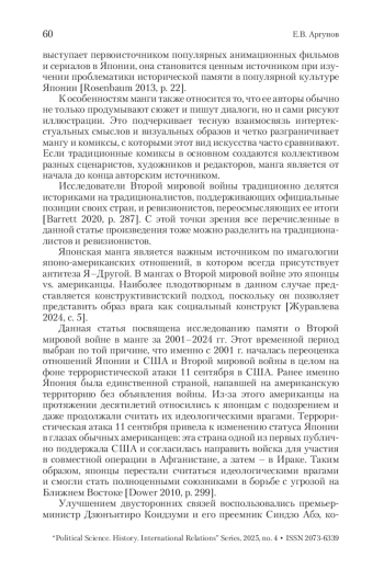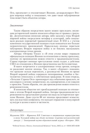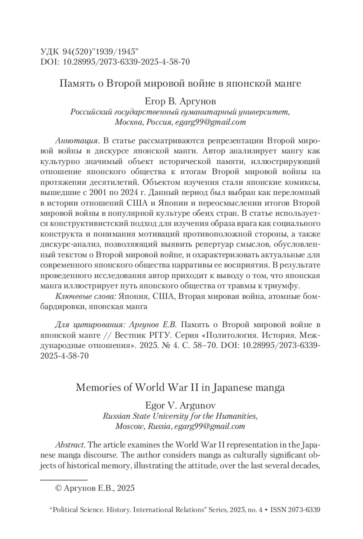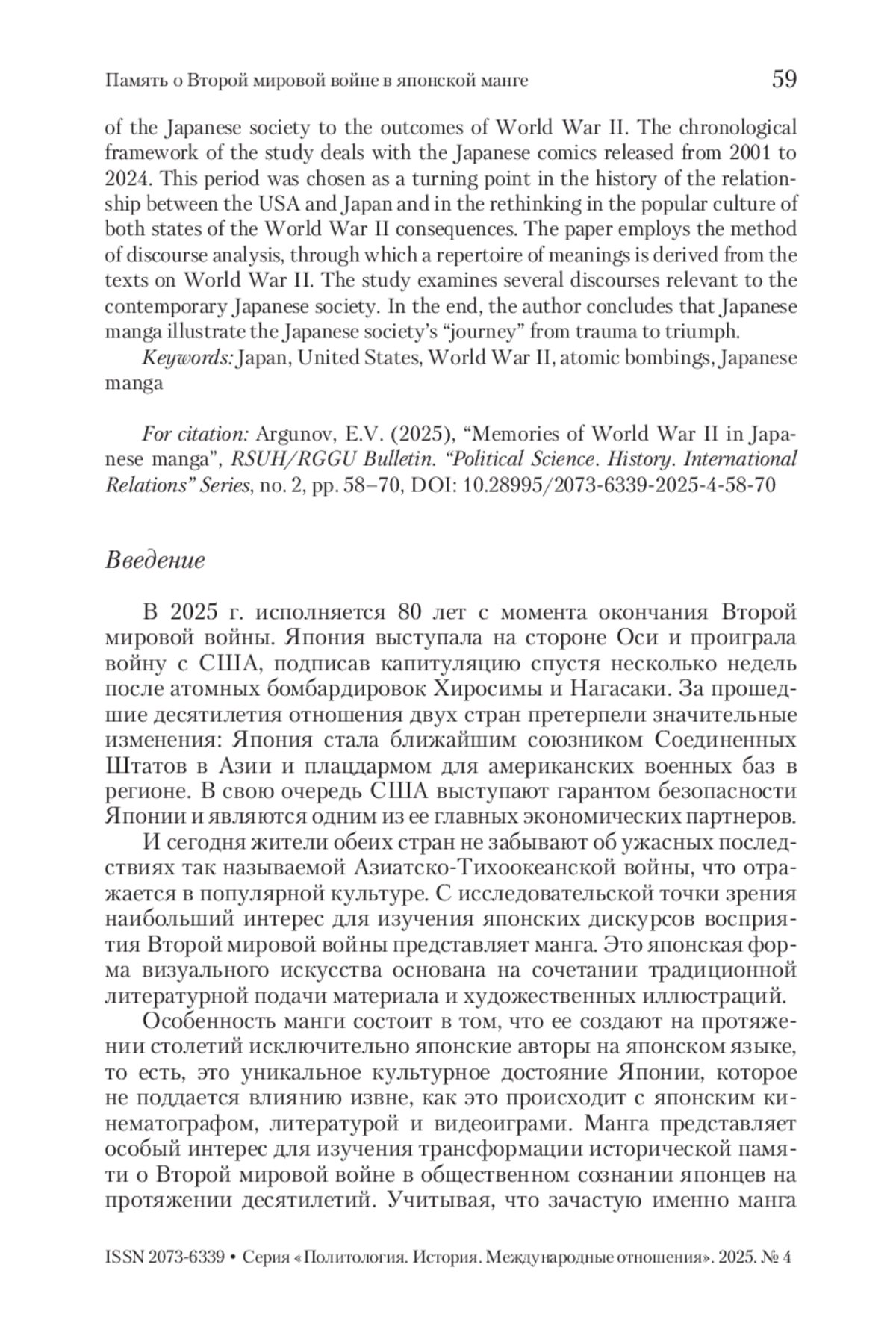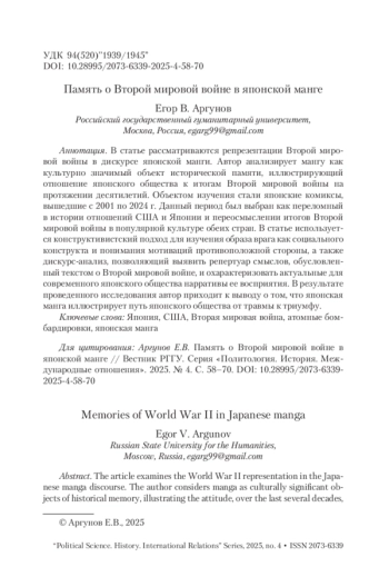 В статье рассматриваются репрезентации Второй мировой войны в дискурсе японской манги. Автор анализирует мангу как культурно значимый объект исторической памяти, иллюстрирующий отношение японского общества к итогам Второй мировой войны на протяжении десятилетий. Объектом изучения стали японские комиксы, вышедшие с 2001 по 2024 г. Данный период был выбран как переломный в истории отношений США и Японии и переосмыслении итогов Второй мировой войны в популярной культуре обеих стран. В статье используется конструктивистский подход для изучения образа врага как социального конструкта и понимания мотиваций противоположной стороны, а также дискурс-анализ, позволяющий выявить репертуар смыслов, обусловленный текстом о Второй мировой войне, и охарактеризовать актуальные для современного японского общества нарративы ее восприятия. В результате проведенного исследования автор приходит к выводу о том, что японская манга иллюстрирует путь японского общества от травмы к триумфу.