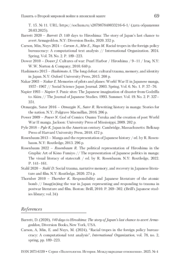 3. Carson, Min, Nuys 2024 - Carson A., Min E., Nuys M. Racial tropes in the foreign policy bureaucracy: A computational text analysis // International Organization. 2024. Spring. Vol. 78. No. 2. P. 189-223.