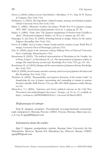 6. Nakar 2003 - Nakar E. Memories of pilots and planes: World War II in Japanese manga, 1957-1967 // Social Science Japan Journal. 2003. Spring. Vol. 6. No. 1. P. 57-76.