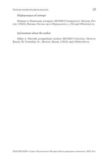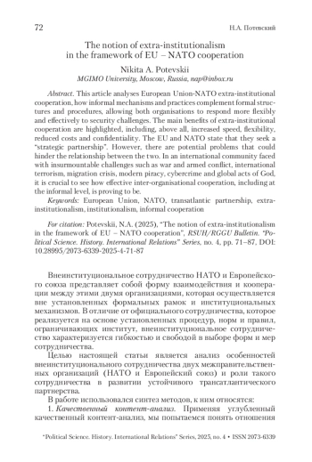 ПОТЕВСКИЙ Н. А. ПОНЯТИЕ ВНЕИНСТИТУЦИОНАЛЬНОСТИ В РАМКАХ СОТРУДНИЧЕСТВА ЕС И НАТО // ВЕСТНИК РГГУ. СЕРИЯ: ПОЛИТОЛОГИЯ. ИСТОРИЯ. МЕЖДУНАРОДНЫЕ ОТНОШЕНИЯ. 2025. № 4