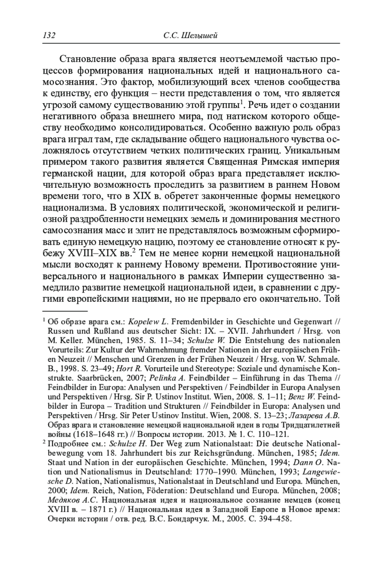 Становление образа врага является неотъемлемой частью про - цессов формирования национальных идей и национального самосознания. Это фактор, мобилизующий всех членов сообщества к единству, его функция – нести представления о том, что является угрозой самому существованию этой группы 1. Речь идет о создании негативного образа внешнего мира, под натиском которого обществу необходимо консолидироваться. Особенно важную роль образ врага играл там, где складывание общего национального чувства осложнялось отсутствием четких политических границ. Уникальным примером такого развития является Священная Римская империя германской нации, для которой образ врага представляет исключительную возможность проследить за развитием в раннем Новом времени того, что в XIX в. обретет законченные формы немецкого национализма. В условиях политической, экономической и религиозной раздробленности немецких земель и доминирования местного самосознания масс и элит не представлялось возможным сформировать единую немецкую нацию, поэтому ее становление относят к рубежу XVIII–XIX вв.