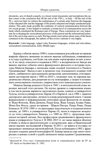 Бурные события начала 1990-х годов помешали российским историкам вовремя обратить внимание на многие важные публикации, появившиеся в те годы за рубежом, тем более так или иначе отреагировать на них в печати. К их числу относится и изданная в 1992 г. и воспринятая на Западе как важное научное событие книга французского филолога и историка культуры Мишеля Баньяра о латинском языке поздней Античности и Раннего Средневековья1. Выход в свет в прошлом году итальянского издания этой книги, снабженного пространными авторскими дополнениями, учитывающими достижения науки с 1988 по 2018 г., позволяет нам, не нарушая академические обычаи, дать рецензию на эту монографию, а заодно и познакомить отечественного читателя с творчеством этого замечательного ученого