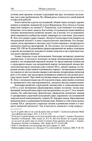 Рецензируемая монография представляет собой переиздание этой книги, вышедшее в свет на французском языке в 1992 г., дополненное автором с учетом новейших исследований. Она содержит богатый материал по истории латинского языка Поздней Античности и Раннего Средневековья и формирования на его основе западно-романских языков, но не является систематическим изложением фактов, характеризующих этот процесс. Перед нами исследование одного из важнейших его аспектов: соотношения в эту эпоху литературного латинского языка, с одной стороны, и разговорного – с другой. Анализируя самые разные источники (трактаты, проповеди, жития святых, хроники, акты церковных соборов, в меньшей мере документы и надписи), автор приходит к выводу, что до конца VIII в., в Италии – до конца IX в. и даже позднее, сохранялось определенное единство между языком образованной элиты и языком плохо или вовсе не образованного населения, что обеспечивало вертикальную коммуникацию между этими социальными группами. Сохранялась и возможность коммуникации на одном языке во всем ареале романской части Европы. Эти выводы очень важны для осмысления социокультурных процессов данной эпохи и информативности дошедших до нас источников. Критически воспринимая некоторые выводы, содержащиеся в данной книге, авторы рецензии оценивают ее очень высоко.