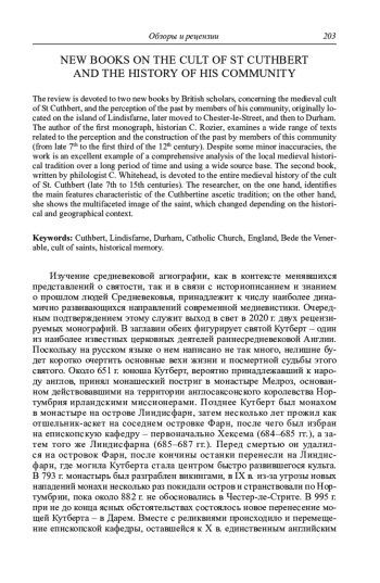 Изучение средневековой агиографии, как в контексте менявшихся представлений о святости, так и в связи с историописанием и знанием о прошлом людей Средневековья, принадлежит к числу наиболее динамично развивающихся направлений современной медиевистики. Очередным подтверждением этому служит выход в свет в 2020 г. двух рецензируемых монографий. В заглавии обеих фигурирует святой Кутберт – один из наиболее известных церковных деятелей раннесредневековой Англии. Поскольку на русском языке о нем написано не так много, нелишне будет коротко очертить основные вехи жизни и посмертной судьбы этого святого. Около 651 г. юноша Кутберт, вероятно принадлежавший к народу англов, принял монашеский постриг в монастыре Мелроз, основанном действовавшими на территории англосаксонского королевства Нортумбрия ирландскими миссионерами.