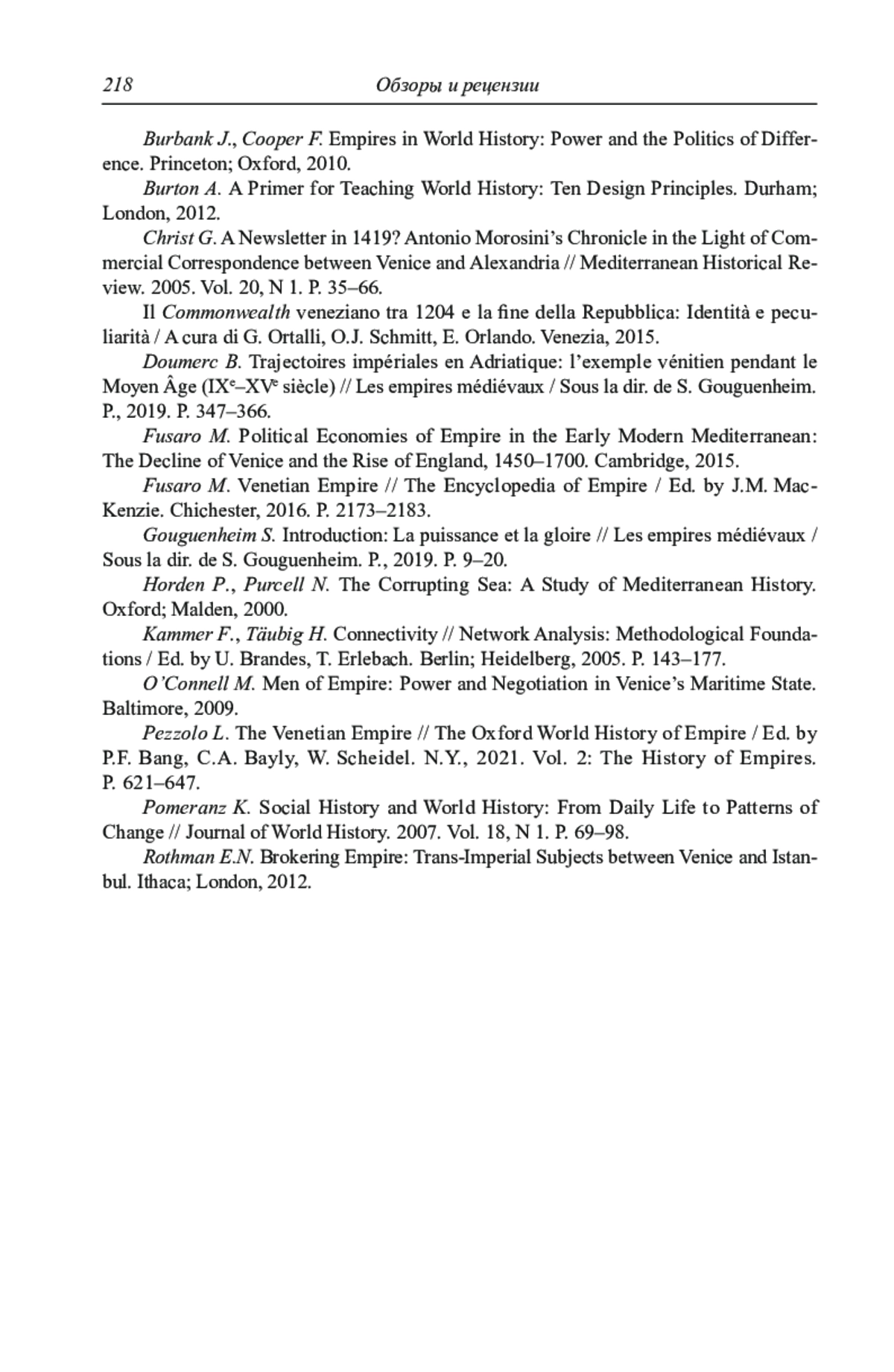 11. Fusaro M. Venetian Empire // The Encyclopedia of Empire / Ed. by J.M. MacKenzie. Chichester, 2016. P. 2173-2183.