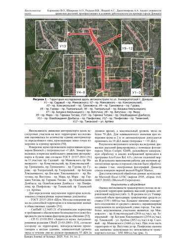 Урбанизация и неуклонное развитие городов влечёт за собой ощутимое усиление антропогенного давления на окружающую среду. В условиях Донбасса основными источниками загрязнения выступают металлургические заводы, угольные шахты, предприятия химической и коксохимической промышленности, а также автотранспорт как основной источник зашумления любого мегаполиса. Выбросы автотранспорта содержат широкий спектр токсикантов, оказывающих негативное влияние на фитоценозы. В результате проведенных исследований определили интенсивность транспортного потока (в среднем 1330 ± 680 ед./час) и вибрационно-акустического зашумления (превышение ПДУ на 37 ± 4% по средним значениям и 24 ± 3% по их максимумам), как комплексного показателя антропогенного загрязнения территории, участки ранжировали по 3 уровням: с высоким, средним и низким антропопрессингом. Экологическое значение влияния антропогенной нагрузки проявлялось в снижении жизнеспособности древесных растений и увеличении числа повреждений. На территориях с высокой интенсивностью транспортного потока (более 1 тыс. ед./час) и повышенным уровнем шумового загрязнения (свыше 30% от предельно допустимого уровня) проявлялись наиболее выраженные негативные биологические последствия: снижение доли деревьев, находящихся в удовлетворительном состоянии, и увеличение количества растений, имеющих высокую долю повреждений или находящихся в критическом состоянии (21-57% от выборки). Морфологические нарушения, такие как искривление ствола, отслоение коры, наличие гнили, изменения архитектоники кроны, а также механические повреждения нарушали целостность защитных тканей растений. Данные факторы создают благоприятные условия для проникновения патогенных микроорганизмов и вредителей, развития гнилостных процессов и общего ухудшения состояния деревьев. На исследуемой территории было идентифицировано 23 вида древесных растений, принадлежащих к 13 различным родам, что свидетельствует об умеренном уровне видового разнообразия. По количеству видов доминирующими являются рода Ulmus L., Acer L. и Populus L. По количеству экземпляров доминируют Robinia pseudoacacia L., Ulmus laevis Pall., Acer pseudoplatanus L., Acer platanoides L., Ulmus pumila L., Syringa vulgaris L., Populus simonii Carrière, Ulmus glabra Huds., Acer saccharum Marshall, Populus bolleana Lauche, Sorbus intermedia (Ehrh.) Pers., Fraxinus pennsylvanica Marshall. Выделили несколько основных видов, подверженных кронированию и санитарной обрезке - Ulmus laevis Pall., Ulmus glabra Huds., Ulmus pumila L. и Robinia pseudoacacia L. Данные растения находились в возрастной группе 50-59 лет и достигли критического возраста в регионе. В результате ветровалов, которые всё чаще происходят в регионе, скелетные ветви таких растений подвержены облому, т. к. новые побеги слабее в креплении и легче поддаются необратимой деформации.