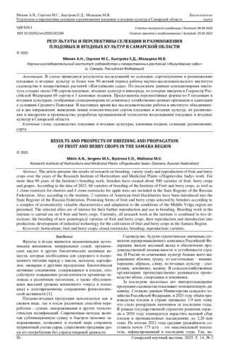 В статье приводятся результаты исследований по селекции, сортоизучению и размножению плодовых и ягодных культур за более чем 90-летний период работы научно-исследовательского института садоводства и лекарственных растений «Жигулёвские сады». По последним данным селекционерами института создано около 500 сортов плодовых, ягодных культур и винограда, из которых введены в Госреестр Российской Федерации 69 сортов и 5 клоновых подвоев. Представлены перспективные формы по 8 плодовым и ягодным культурам, отобранные селекционерами по комплексу хозяйственно-ценных признаков и адаптации к условиям Среднего Поволжья. В настоящее время все исследовательские работы в институте объединяются в два направления: выведение новых помологических сортов плодовых и ягодных культур, их размножение и внедрение в производство; разработка промышленной технологии возделывания плодовых и ягодных культур в Самарской области.