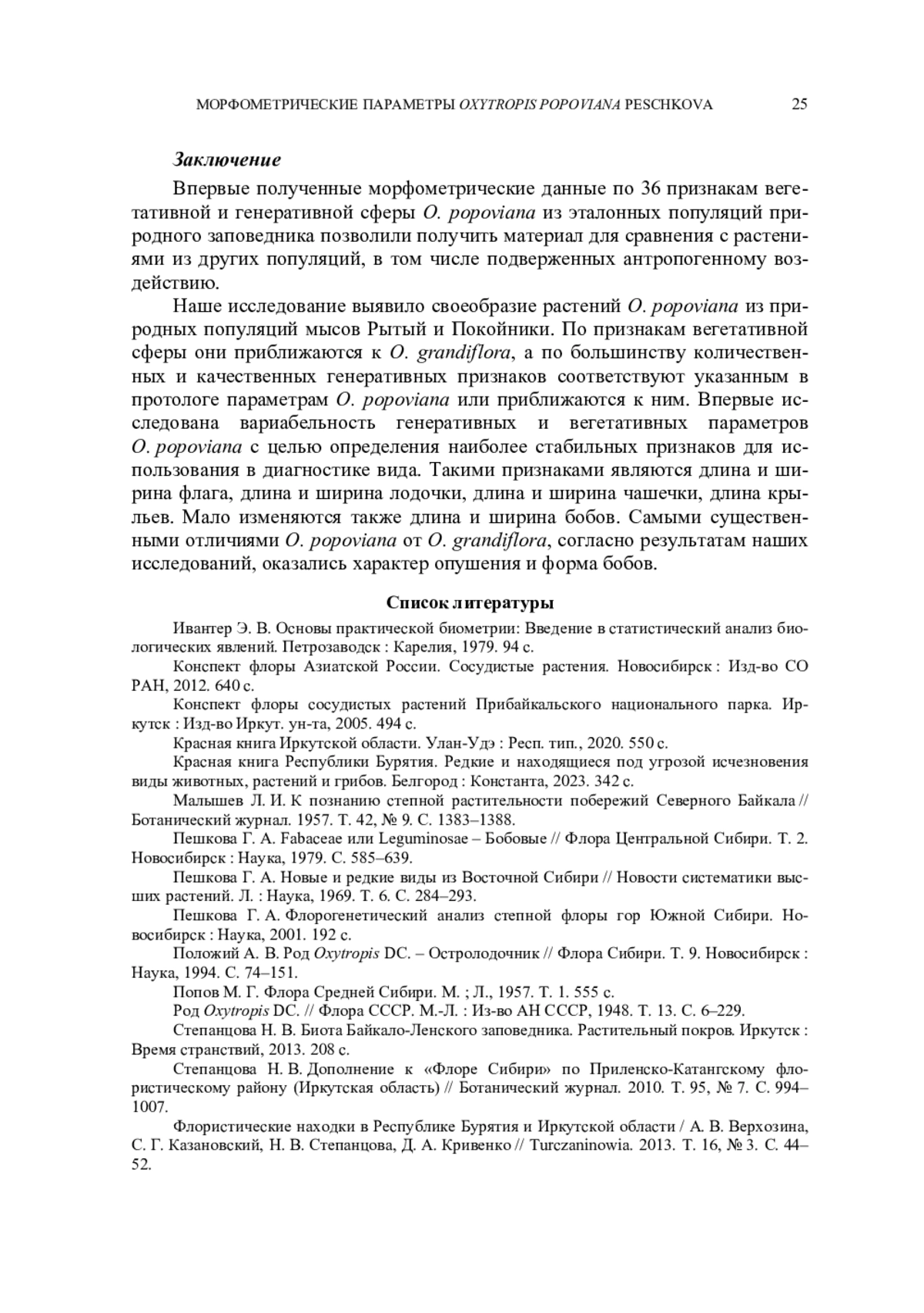 Впервые исследованы морфометрические показатели (высота растения, количество, длина и ширина вегетативных и генеративных органов) живых экземпляров редкого эндемичного остролодочника Попова (Oxytropis popoviana Peschkova) из эталонных природных популяций северо-западного побережья оз. Байкал. Изучена изменчивость различных признаков. Проведено сравнение полученных морфометрических параметров O. popoviana с приведёнными в протологе данного вида и с параметрами близкого вида Oxytropis grandiflora (Pall.) DC.