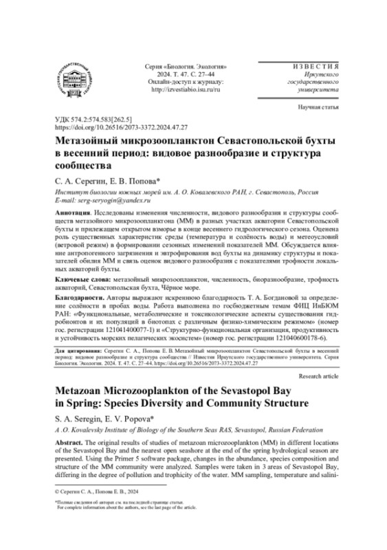 СЕРЕГИН С. А., ПОПОВА Е. В. МЕТАЗОЙНЫЙ МИКРОЗООПЛАНКТОН СЕВАСТОПОЛЬСКОЙ БУХТЫ В ВЕСЕННИЙ ПЕРИОД: ВИДОВОЕ РАЗНООБРАЗИЕ И СТРУКТУРА СООБЩЕСТВА // ИЗВЕСТИЯ ИРКУТСКОГО ГОСУДАРСТВЕННОГО УНИВЕРСИТЕТА. СЕРИЯ: БИОЛОГИЯ. ЭКОЛОГИЯ. 2024. ТОМ 47