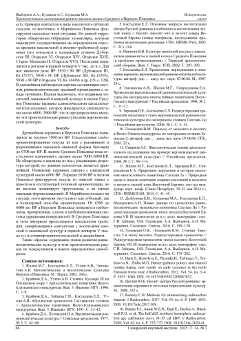 9. Зарецкая Н.Е., Костылева Е.Л. Радиоуглеродная хронология начального этапа верхневолжской ранненеолитической культуры (по материалам стоянки Сахтыш-2а) // Российская археология. 2008. № 1. С. 5-14.