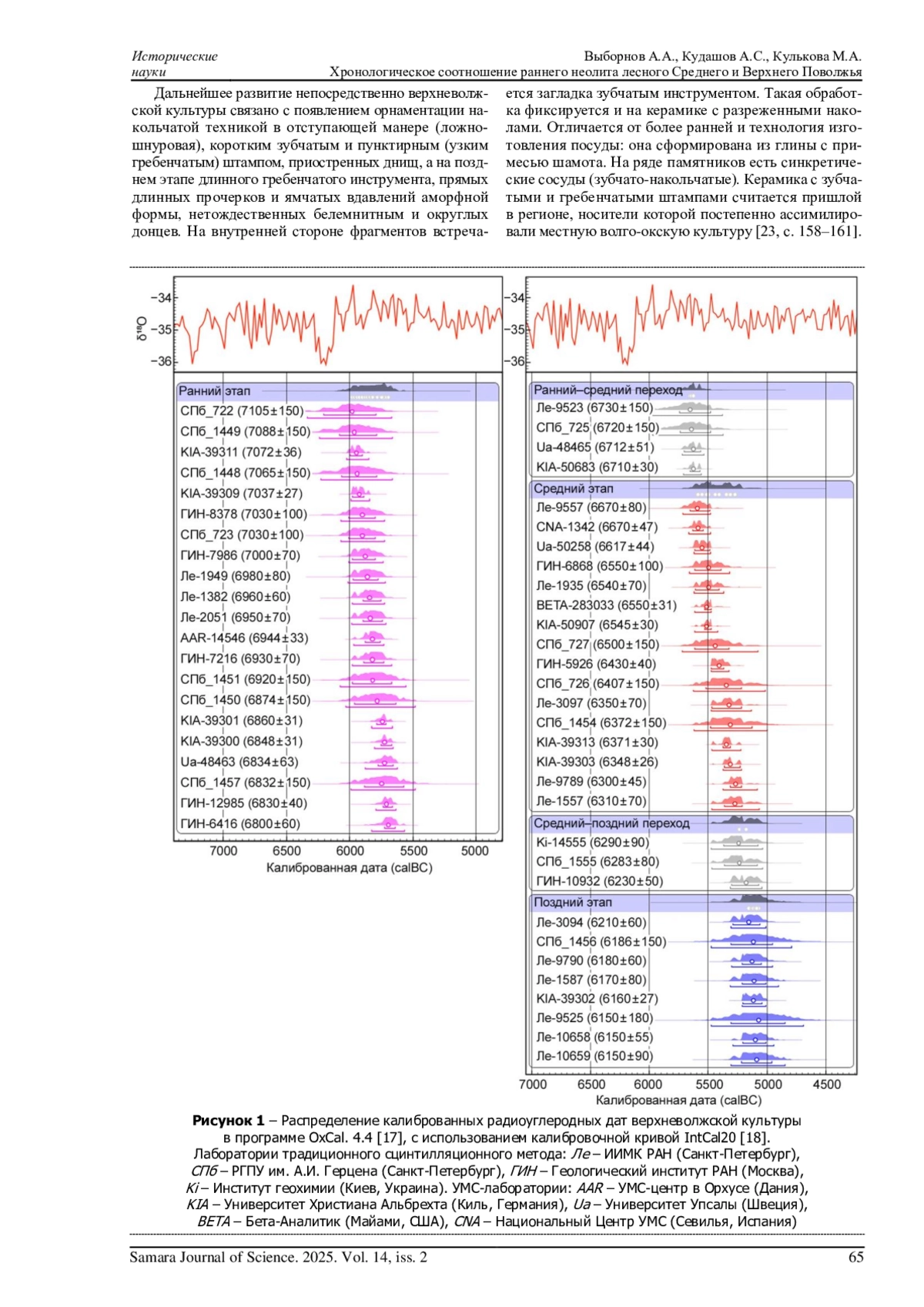 В статье рассматривается вопрос хронологии и содержания этапов раннего неолита Верхнего и лесного Среднего Поволжья. Учитывались наиболее валидные радиоуглеродные даты, полученные по углю, костям животных и нагару, имеющие невысокий показатель δ¹³C. Раннему этапу верхневолжской (волго-окской) культуры соответствуют определениям конца VII - первой трети VI тыс. до н. э. В лесном Среднем Поволжье значения свидетельствуют о неолитизации около 6800 BP при импульсе от елшанской культуры. В сравниваемых регионах наибольшие сходства отмечаются в начальный период. С 6500 лет BP в верхневолжской культуре развиваются накольчатая и зубчатая традиции орнаментации. В Марийские леса около этого рубежа проникают носители керамики с подтреугольными/подовальными наколами. Зубчатая и пунктирная техники в дубовско-отарской культуре не представлены. В верхневолжской среде с 6300 BP появляется гребенчатый, прочерченный и ямочный, включая белемнитный, орнамент завершающего этапа раннего неолита. В лесном Среднем Поволжье до начала V тыс. до н. э. существует накольчатая традиция вплоть до контактов с льяловской и камской культурами. Можно заключить о различающихся хронологических и содержательных этапах в раннем неолите двух регионов.