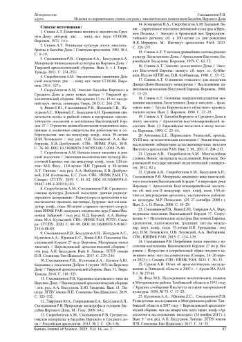 5. Скоробогатов А.М. Энеолит бассейна Верхнего и Среднего Дона в свете новых данных // Тверской археологический сборник. Материалы 13-го-15-го заседаний науч.-метод. семинара. Тверь, 2013. С. 264-278. EDN: HYHQFB