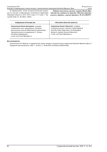 11. Смольянинов Р.В. Керамика ксизовского типа на Верхнем Дону // Верхнедонской археологический сборник / отв. ред. А.А. Бессуднов, Е.Ю. Захарова. Вып. 11. Липецк: ЛГПУ имени П.П. Семенова-Тян-Шанского, 2019. С. 323-332. EDN: XHXFZO
