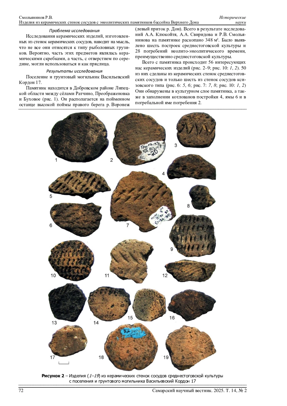 9. Смольянинов Р.В., Бессуднов А.Н., Желудков А.С., Куличков А.А., Юркина Е.С., Яниш Е.Ю. Поселение Васильевский Кордон 27 на р. Воронеж. Материалы эпохи энеолита // Верхнедонской археологический сборник / отв. ред. А.Н. Бессуднов. Вып. 8. Липецк: ЛГПУ имени П.П. Семенова-Тян-Шанского, 2017. С. 229-244. EDN: YSARWT