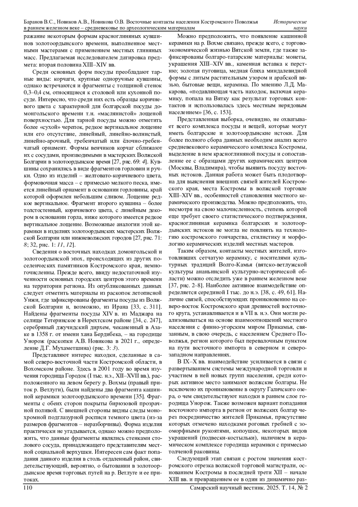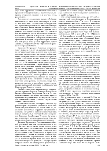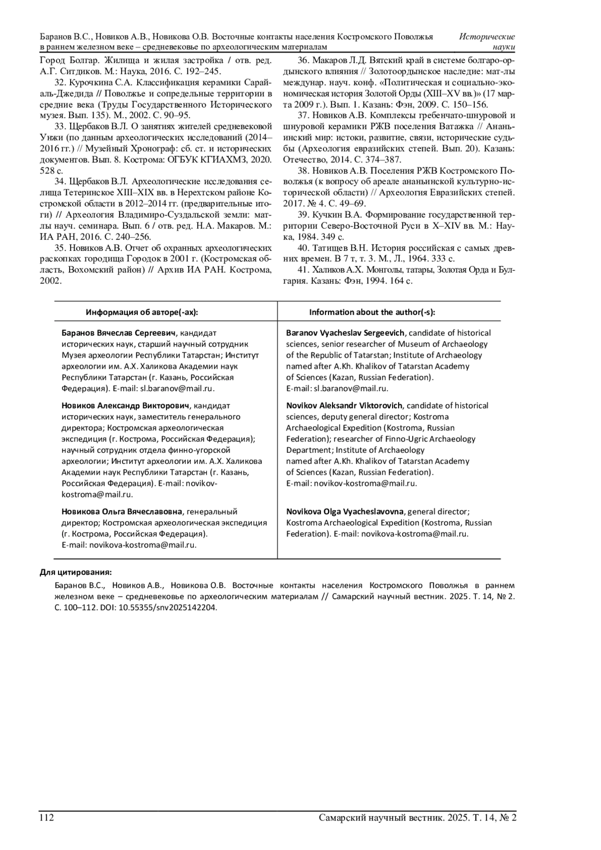 БАРАНОВ В. С., НОВИКОВ А. В., НОВИКОВА О. В. ВОСТОЧНЫЕ КОНТАКТЫ НАСЕЛЕНИЯ КОСТРОМСКОГО ПОВОЛЖЬЯ В РАННЕМ ЖЕЛЕЗНОМ ВЕКЕ - СРЕДНЕВЕКОВЬЕ ПО АРХЕОЛОГИЧЕСКИМ МАТЕРИАЛАМ // САМАРСКИЙ НАУЧНЫЙ ВЕСТНИК. 2025. ТОМ 14, № 2