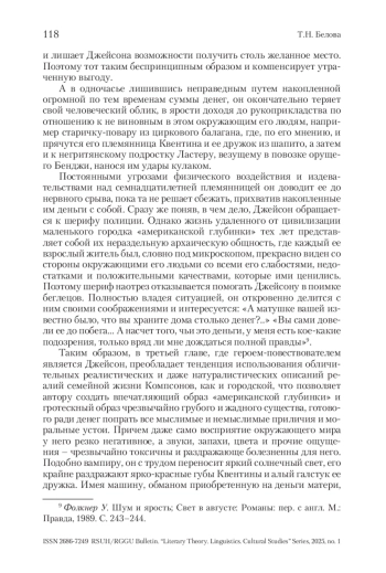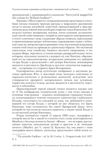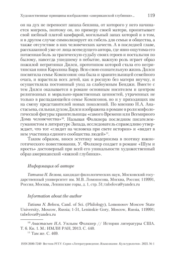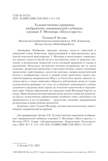 Американская готика представляет собой сложное культурное и литературное явление, обеспеченное региональной спецификой США. Под «зонтиком» термина помещаются две своеобразные традиции готической литературы – новоанглийская, в большей степени сфокусированная на погружении в глубины человеческой психики и тщательно фиксирующая различные рефлексии персонажей, и южная, обязанная своим появлением тяжелым переживаниям и размышлениям южан по поводу смерти мифологического прекрасного Юга в результате Гражданской войны. В силу специфической социокультурной жизни на Юге не было крупных урбанистических центров, сердцем Юга является глубинка, с характерной для нее укорененностью в традициях прошлого. Южная глубинка – скорее топос, обобщенное место разворачивания смыслов, связанных с уникальным южным опытом жизни, часто набор устойчивых фабульных формул, а также общих мотивов, проблем и сюжетов. В статье рассматриваются некоторые типические черты поэтики южной готики.