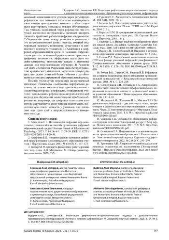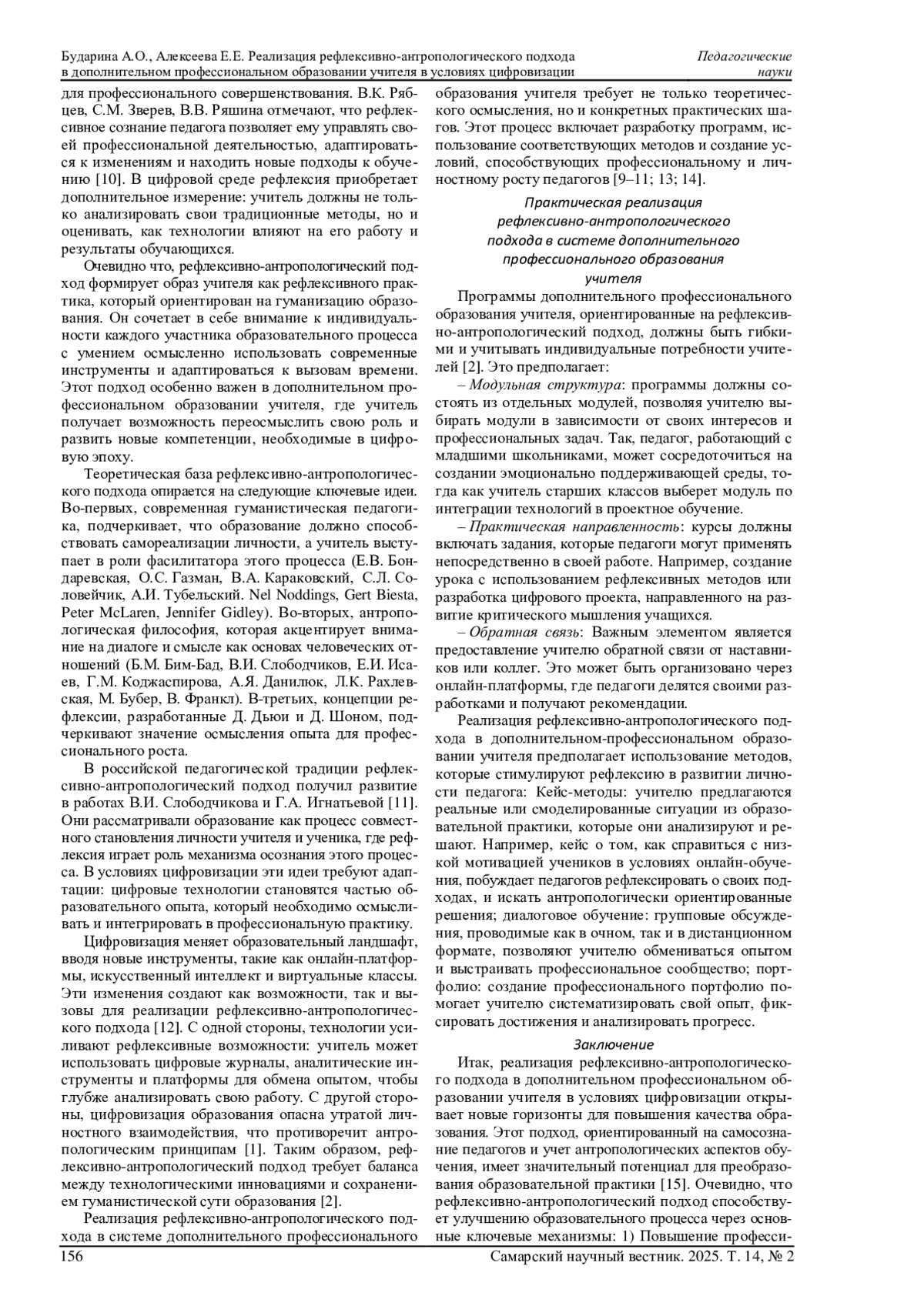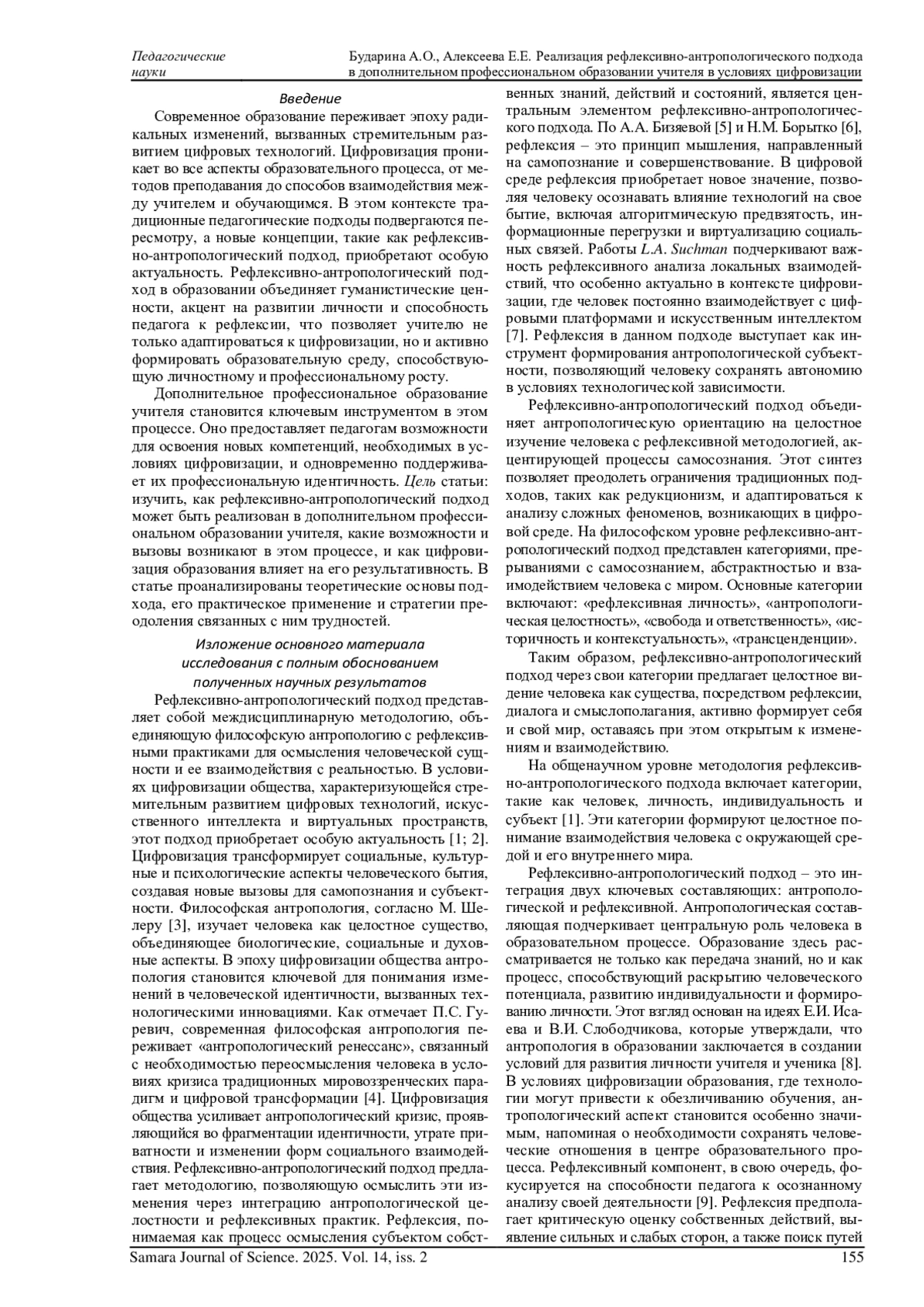 БУДАРИНА А. О., АЛЕКСЕЕВА Е. Е. РЕАЛИЗАЦИЯ РЕФЛЕКСИВНО-АНТРОПОЛОГИЧЕСКОГО ПОДХОДА В ДОПОЛНИТЕЛЬНОМ ПРОФЕССИОНАЛЬНОМ ОБРАЗОВАНИИ УЧИТЕЛЯ В УСЛОВИЯХ ЦИФРОВИЗАЦИИ // САМАРСКИЙ НАУЧНЫЙ ВЕСТНИК. 2025. ТОМ 14, № 2