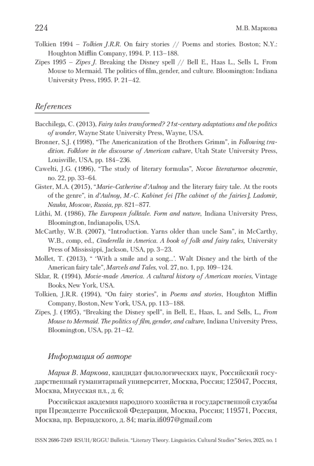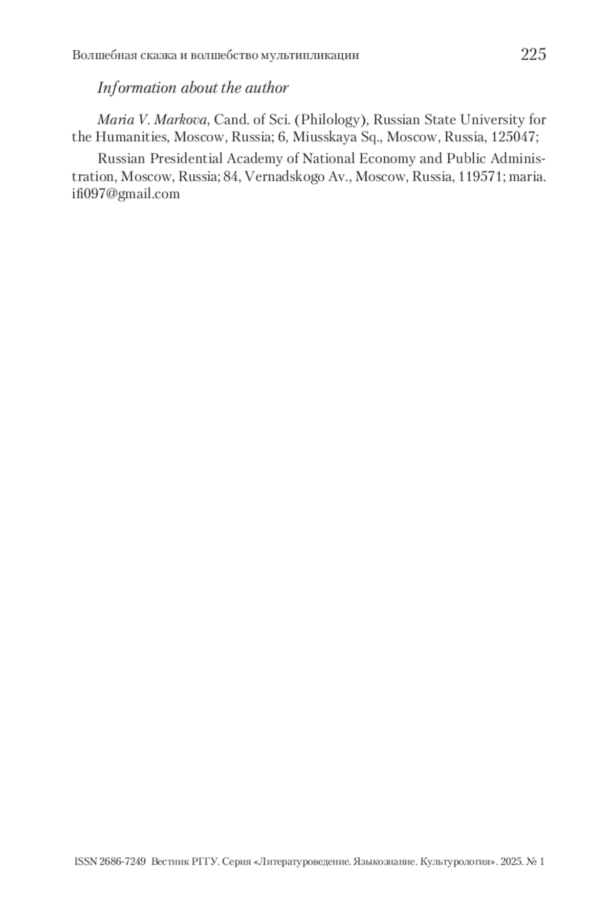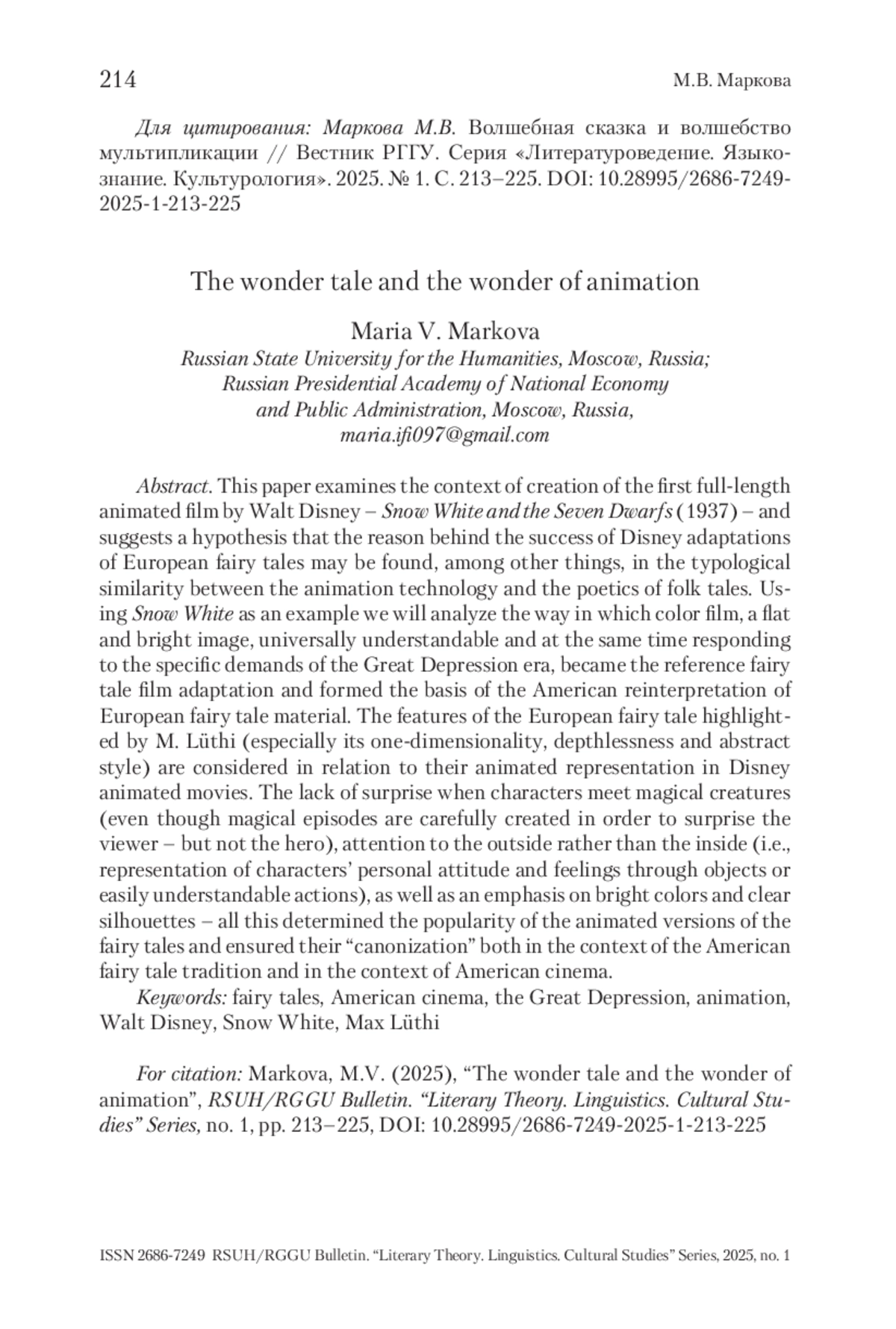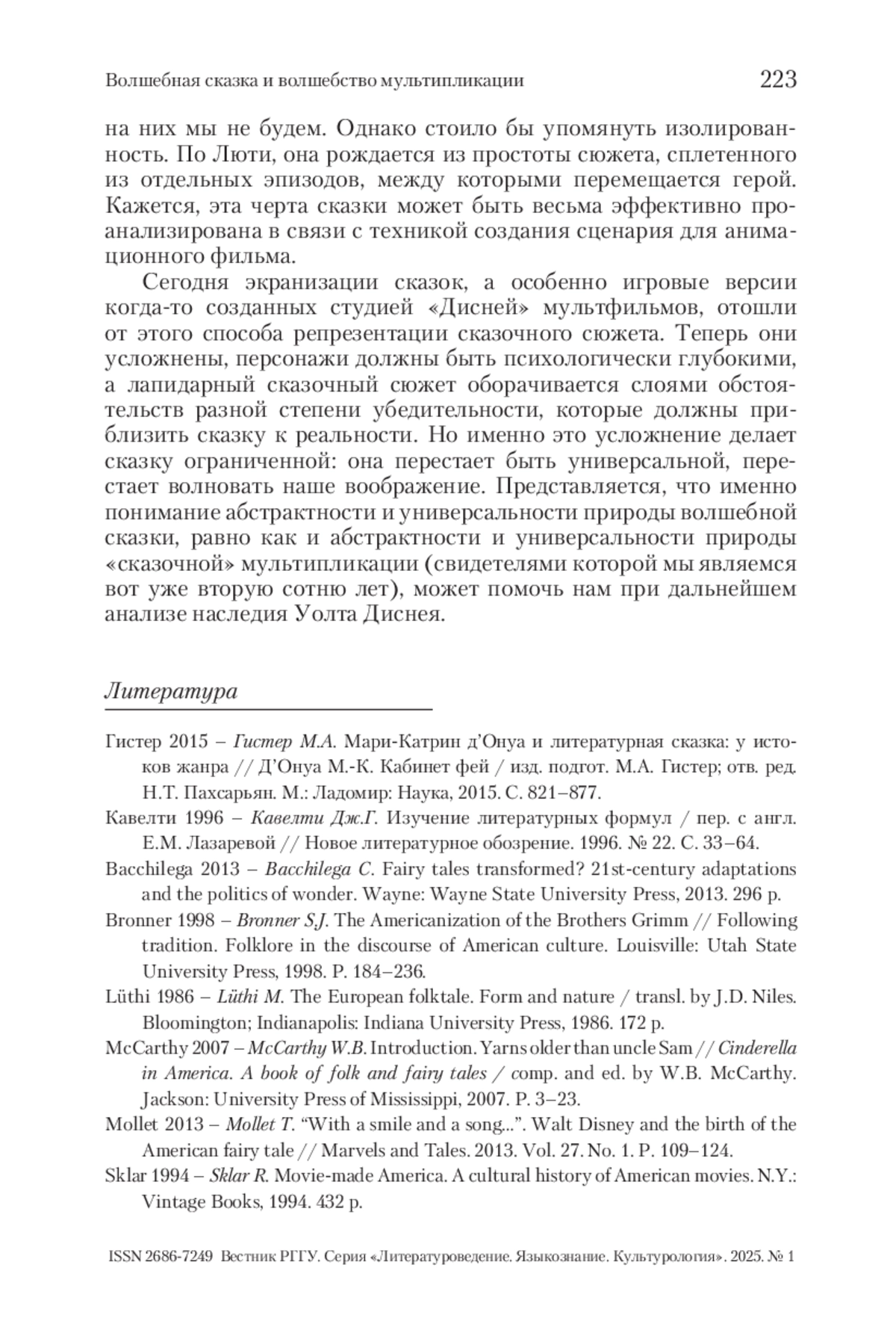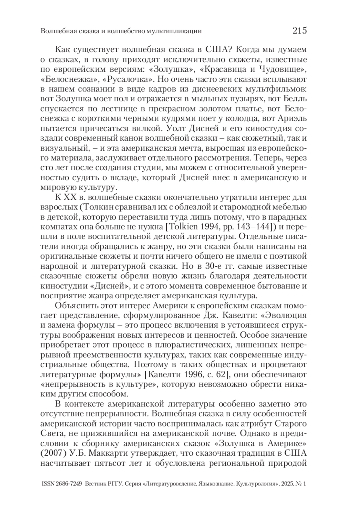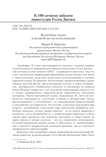 МАРКОВА М. В. ВОЛШЕБНАЯ СКАЗКА И ВОЛШЕБСТВО МУЛЬТИПЛИКАЦИИ // ВЕСТНИК РГГУ. СЕРИЯ «ЛИТЕРАТУРОВЕДЕНИЕ. ЯЗЫКОЗНАНИЕ. КУЛЬТУРОЛОГИЯ». 2025. № 1