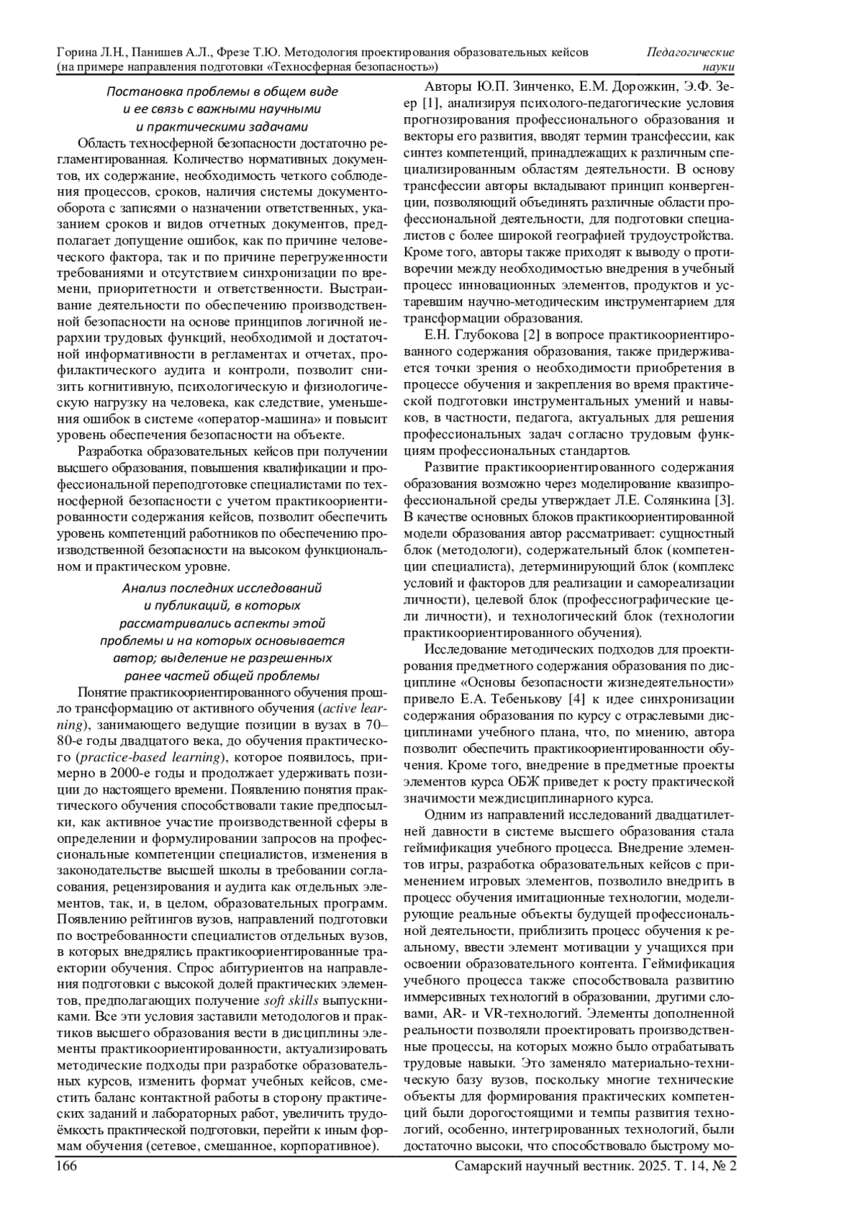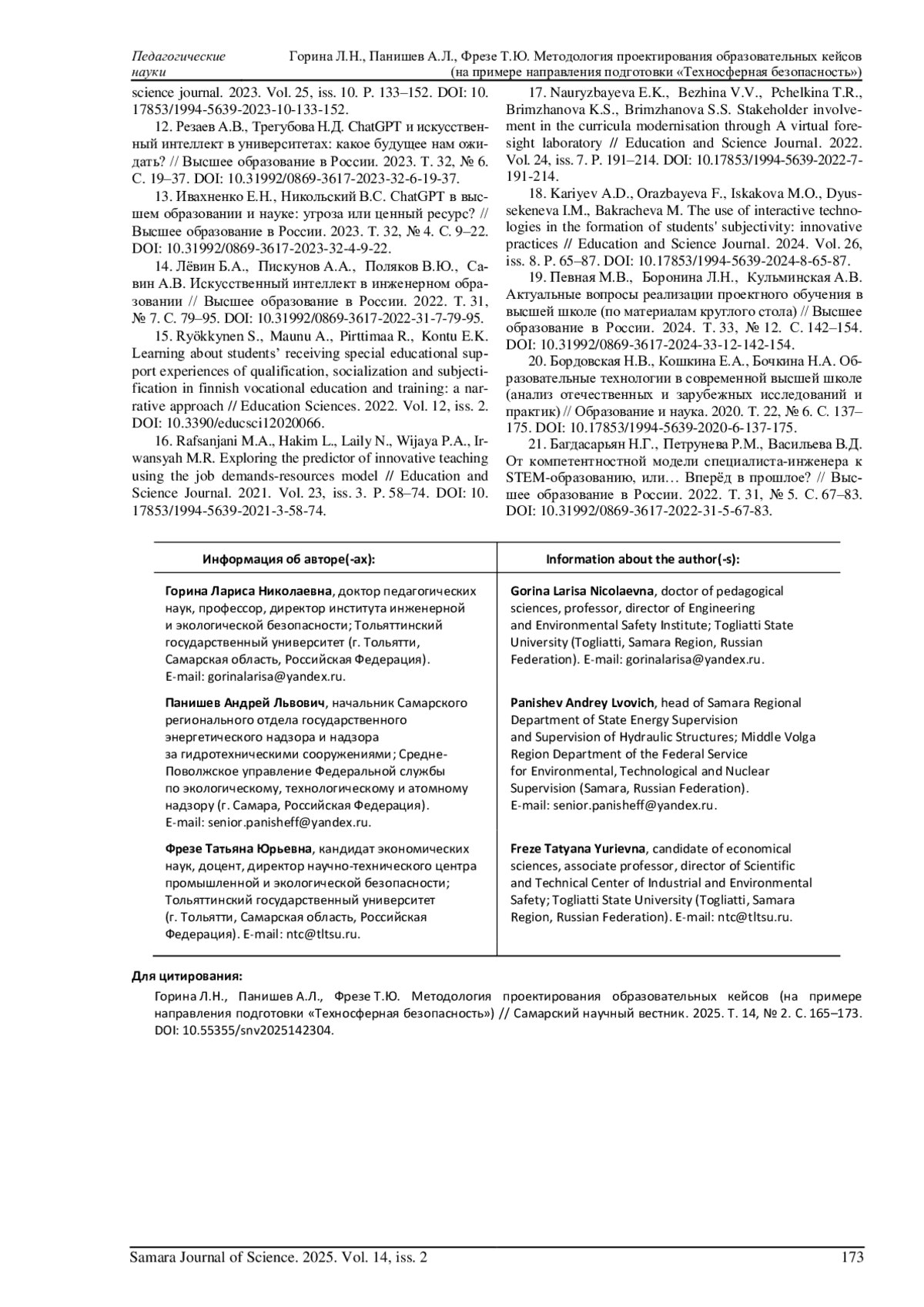 ГОРИНА Л. Н., ПАНИШЕВ А. Л., ФРЕЗЕ Т. Ю. МЕТОДОЛОГИЯ ПРОЕКТИРОВАНИЯ ОБРАЗОВАТЕЛЬНЫХ КЕЙСОВ (НА ПРИМЕРЕ НАПРАВЛЕНИЯ ПОДГОТОВКИ «ТЕХНОСФЕРНАЯ БЕЗОПАСНОСТЬ») // САМАРСКИЙ НАУЧНЫЙ ВЕСТНИК. 2025. ТОМ 14, № 2