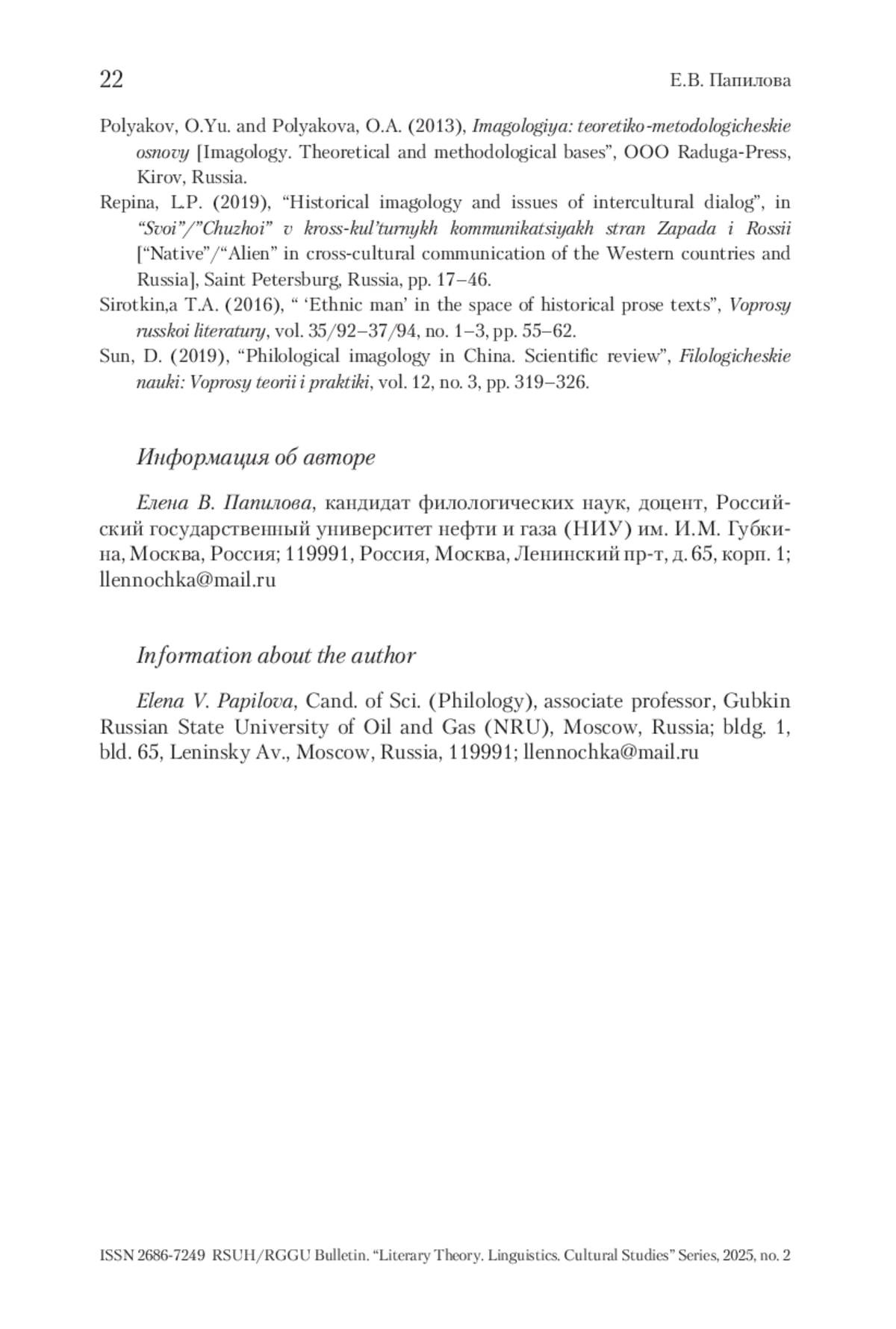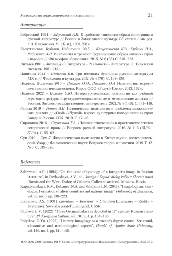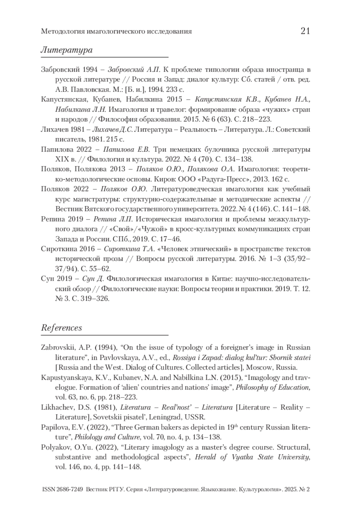 Литературоведческая имагология как дисциплина компаративистики (сравнительного литературоведения), изучающая стереотипные образы «других», «чужих» наций, стран, культур, традиций и религий в текстах художественной литературы, уже довольно прочно закрепилась в науке. Однако ее теоретические основы все же не сформировались окончательно. Это касается и понятийного аппарата, и методологии исследования. В статье предлагается механизм анализа образа «чужого», прежде всего – персонажа-иностранца. Автор выделяет следующие «элементы» анализа: портрет, костюм, возраст, «говорящие» имена героев, их речевая характеристика, предыстория, социальный статус (сословие, профессия), предметная детализация, хронотоп, высказываемые характеристики, степень «обруселости», национальное самосознание, национальный характер, менталитет, обозначение автором персонажа как «типичного» представителя своей нации, использование антитезы для выявления различий между «своими» и «чужими», раскрытие персонажа в сюжете, его место в системе персонажей. Кроме того, мотивы в произведении, ценностная позиция автора (выражающаяся в тональности повествования, его эмоциональном колорите) и даже сам жанр произведения могут также нести в себе имагологическую информацию. Таким образом, художественный текст – многоуровневый объект имагологического анализа, в котором даже незначительные, на первый взгляд, элементы могут нести в себе ценную информацию для исследователя. Теоретические положения подкреплены примерами анализа из русской художественной литературы XIX в. Статья содержит краткую библиографию по состоянию данного вопроса в современной науке.