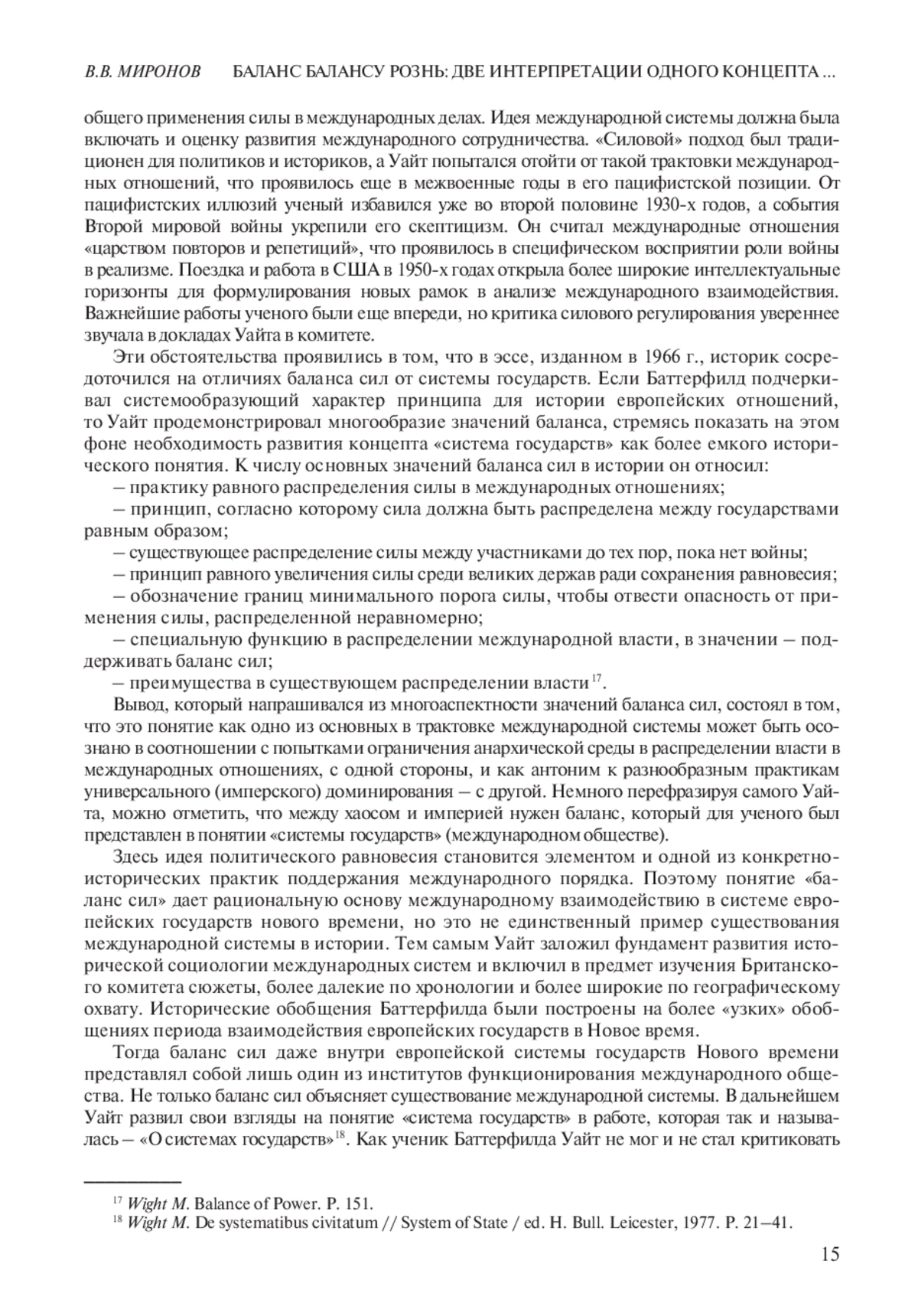 15. Wight M. Balance of Power // Diplomatic Investigations. Essays in the Theory of International Politics / eds H. Butterfield, M. Wight. London, 1966. P. 148-175.