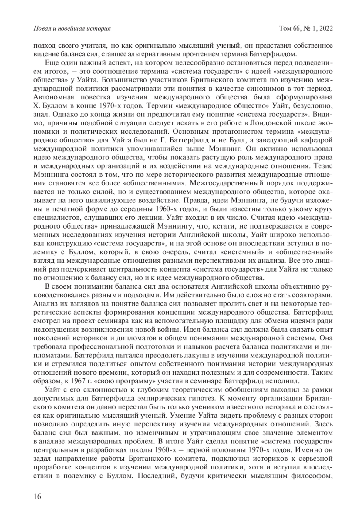 Статья посвящена анализу содержательных различий понятия «баланс сил» в системе взглядов двух основателей Английской школы международных отношений – Г. Баттерфилда (1900–1979) и М. Уайта (1913–1972). Концепция школы получила признание в 1970-е годы как оригинальный подход к изучению международной политики благодаря работам Х. Булла. Со временем понятие «международное общество», разработанное ученым, стало символом для обозначения всей Английской школы и маркером для демонстрации специфики ее концепции. Между тем книга Х. Булла отразила итоги многолетних дискуссий внутри специфического научного сообщества. Цель статьи – показать часть процесса формирования оригинальной научной концепции на примере изучения внутренней полемики двух основателей сообщества в 1960-х годах. Источниками работы послужили опубликованные тексты представителей Английской школы международных отношений. Новизна предпринятого подхода состоит в выявлении роли понятия в системе взглядов двух разных ученых, с учетом того, что Уайт был учеником Баттерфилда. Г. Баттерфилд видел в балансе сил сущностную историческую основу любых рассуждений о международной политике. Понятие баланса для него являлось интегральным концептом исторического изучения международных отношений. М. Уайт считал идею международной системы основой для создания международной теории, где баланс сил был важным, но не единственным и исчезающим элементом практики межгосударственного взаимодействия. В результате разного понимания термина «баланс сил» Баттерфилд со временем считал свою роль в создании Британского комитета по изучению международной политики исполненной к 1967 г., а Уайт сумел направить работу участников Английской школы на разработку новой теоретической гипотезы, которая привела в итоге к появлению концепции международного общества и формированию научной школы