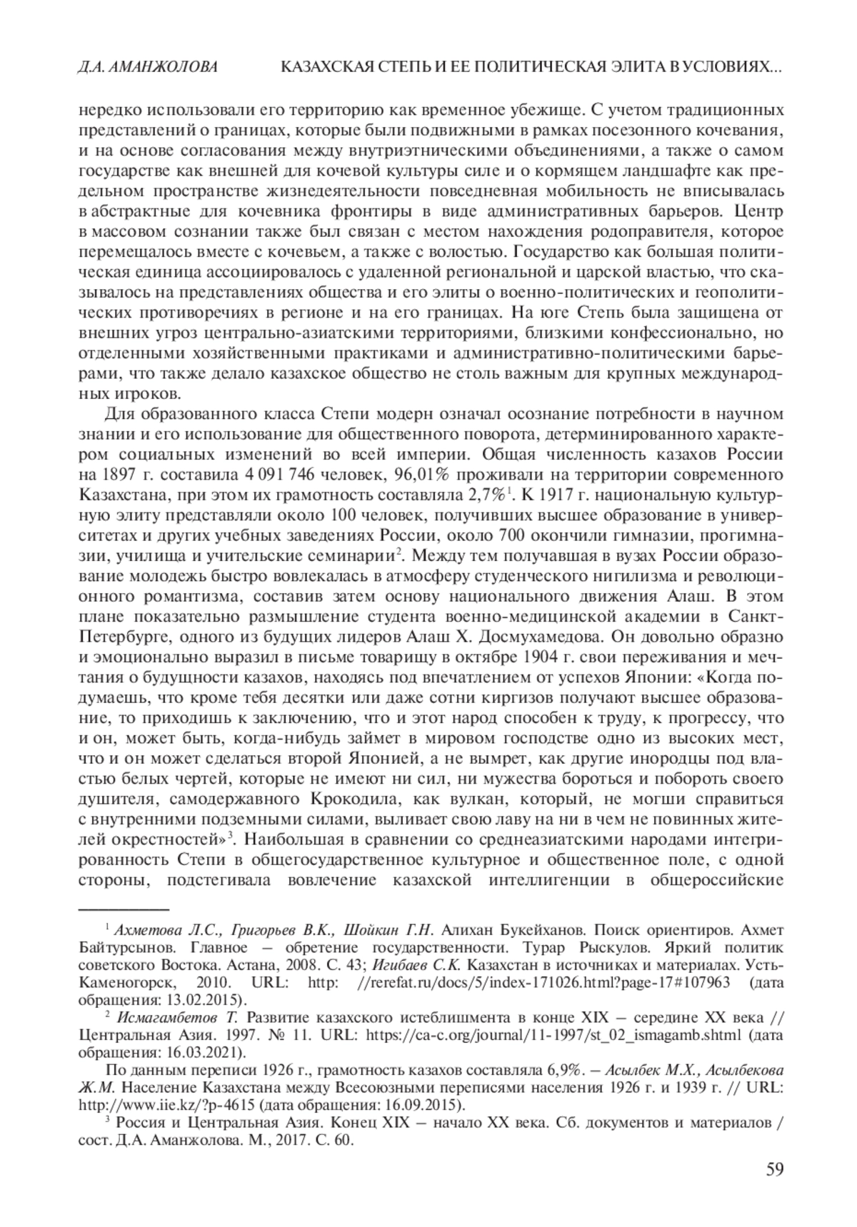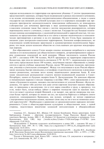 Начало XX в. отмечено более активным вовлечением традиционных обществ России в модернизационные процессы, что призывало просвещенные национальные элиты артикулировать новые вызовы, осознавать многонародность как естественное воплощение целостности евразийского пространства страны, учитывая в то же время потребности внутриэтнической консолидации в интересах адаптации к быстро меняющимся условиям. Для России в ее имперском и советском воплощениях такая культурная сложность всегда была важным фактором тесной взаимосвязи внутренней и внешней политики. Впрочем, далеко не все народы и их элиты, получив в 1917 г. возможность включиться в политический процесс, смогли заявить о себе как об относительно самостоятельных или влиятельных его участниках. В Казахской степи осознание этнической целостности отставало от вызовов современности, и даже элита кочевого общества лишь изредка пыталась осмыслить место региона в геополитическом контексте. Это было связано, видимо, с состоянием самого социума на пороге революционных потрясений и его локализацией в политическом пространстве Евразии. Не случайно специалисты по истории геополитики применительно к Центральной Азии в начале XX в. концентрируются на анализе соседних современному Казахстану регионах.