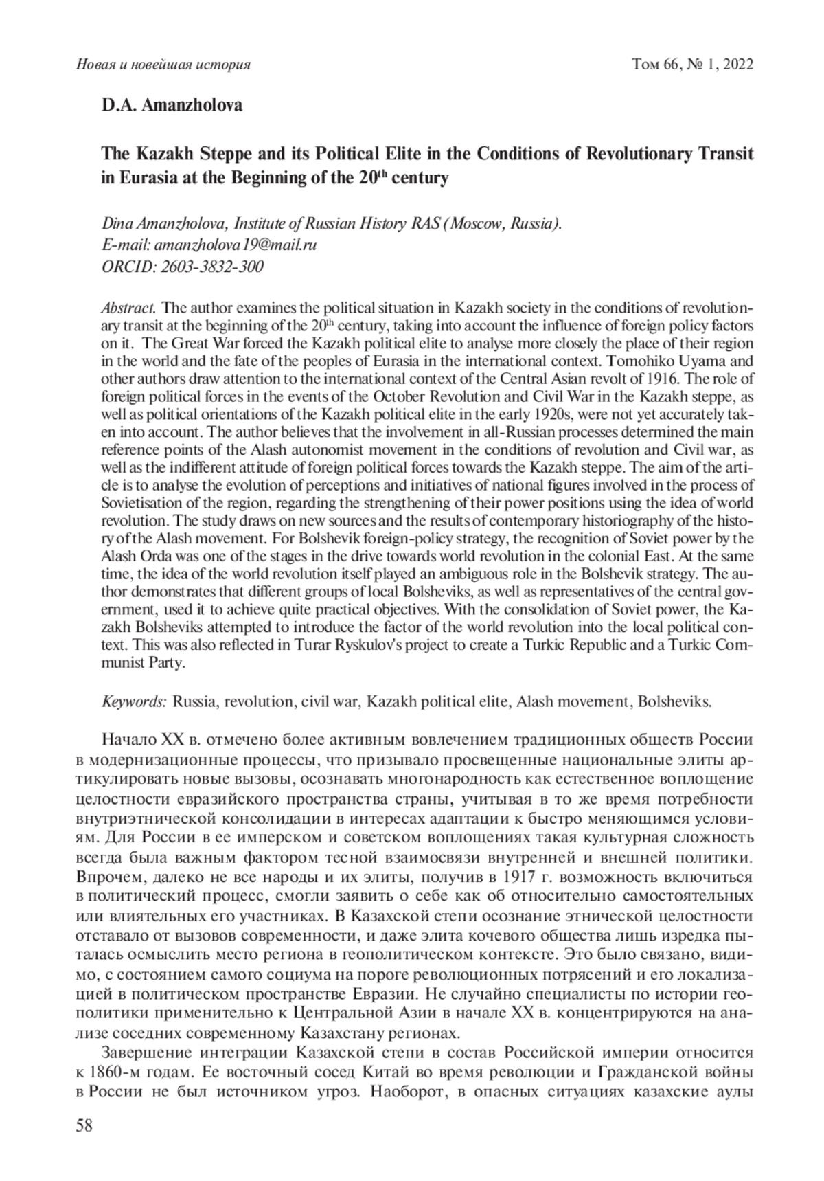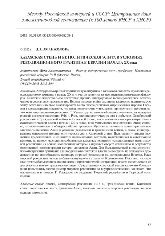Автор рассматривает политическую ситуацию в казахском обществе в условиях революционного транзита в начале XX в. с учетом влияния на нее внешнеполитических факторов. Казахское общество было достаточно прочно интегрировано в общероссийское политическое и социальное пространство. Первая мировая война заставила казахскую политическую элиту более внимательно анализировать место своего региона в мире и судьбы народов Евразии в международном аспекте, что пока недостаточно учитывается при изучении истории казахского национального движения. Т. Уяма и другие авторы обращают внимание на международный контекст восстания 1916 г. Роль внешнеполитических сил в событиях Октябрьской революции и Гражданской войны в Казахской степи, как и политических ориентирах казахской политической элиты в начале 1920-х годов, пока учитывается недостаточно. Автор считает, что вовлеченность в общероссийские процессы обусловила основные ориентиры автономистского движения Алаш в условиях революции и гражданской войны, а также индифферентное отношение внешнеполитических сил к Казахской степи. Цель статьи – анализ эволюции представлений и инициатив национальных деятелей, включившихся в советизацию региона, по поводу укрепления собственных властных позиций с использованием идеи мировой революции на основе вовлеченных автором в научный оборот источников и результатов современной историографии истории движения Алаш. Для большевистской внешнеполитической стратегии признание алашординцами советской власти было одним из эпизодов в продвижении по своеобразному коридору мировой революции на колониальном Востоке. Идея мировой революции играла амбивалентную роль в стратегии большевиков. Показано, что разные группы большевиков-националов и представителей центральной власти использовали ее для решения вполне практических задач. С укреплением советской власти казахские большевики попытались ввести фактор мировой революции во внутриполитический контекст. Это выразилось и в проекте Т. Рыскулова по созданию Тюркской республики и Тюркской компартии.